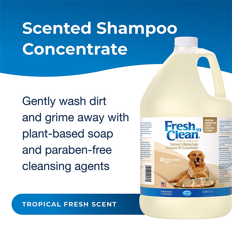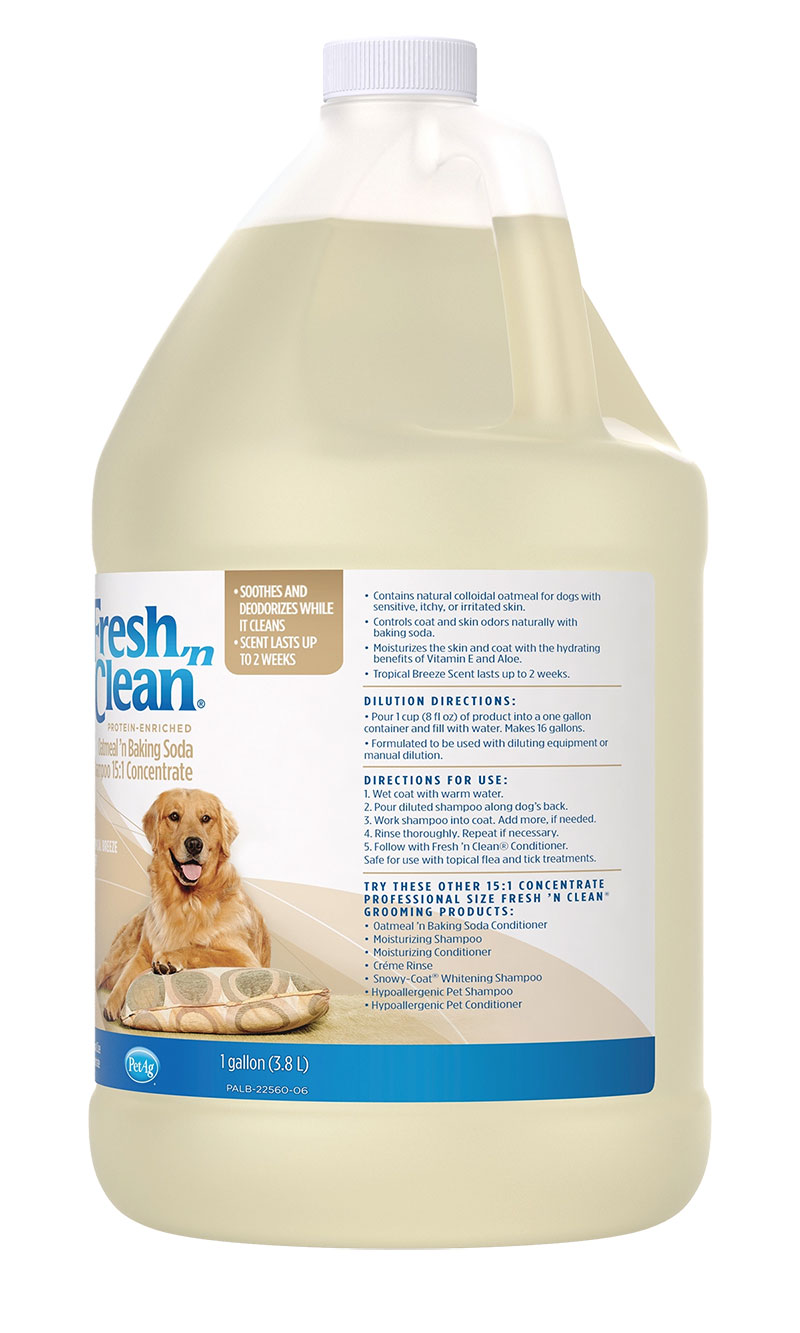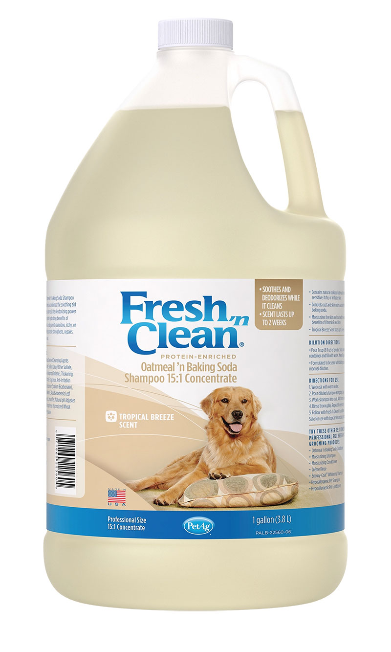 The preferred choice of groomers, Fresh ‘n Clean Oatmeal ’n Baking Soda Shampoo is ideal for dogs with dry, itchy and sensitive skin. The natural soap-free formula is 95% plant-derived and combines the soothing qualities of colloidal oatmeal with the odor-controlling power of baking soda. Infused with protein, vitamin E and aloe, this shampoo repairs and moisturizes for a healthy, manageable coat. The 15:1 concentration saves on shipping costs with more washes per bottle. And the Fresh ’n Clean signature, long-lasting fragrance keeps your dog smelling fresh up to two weeks.