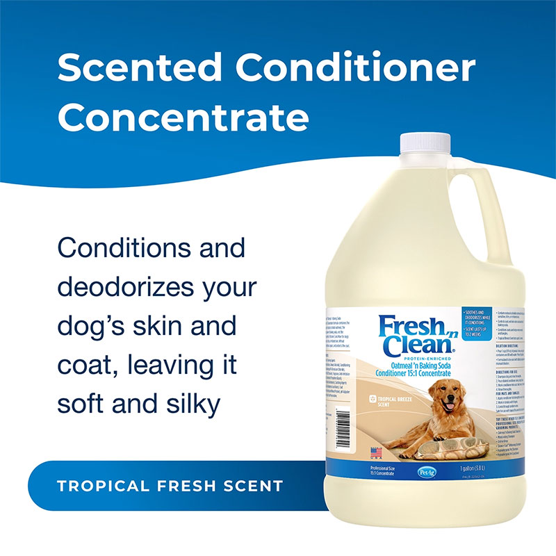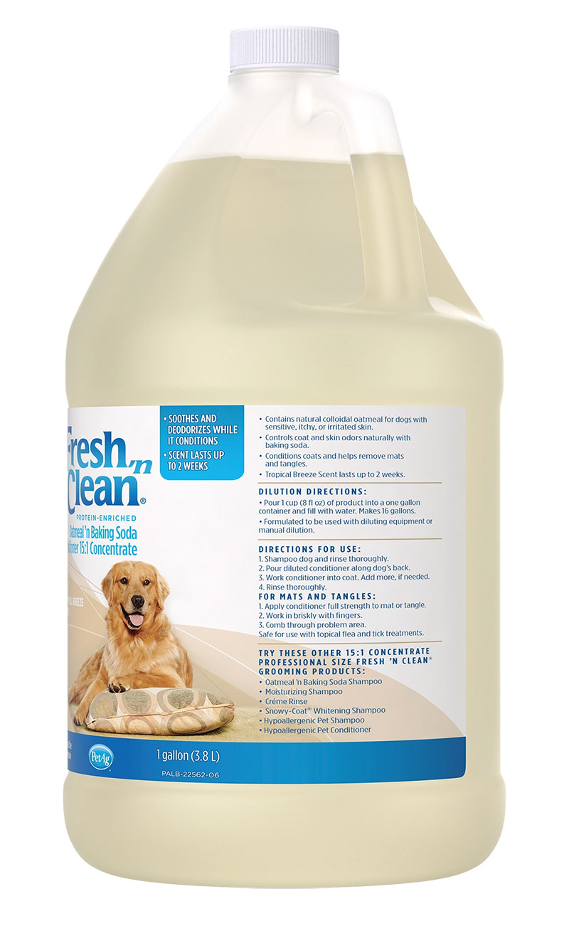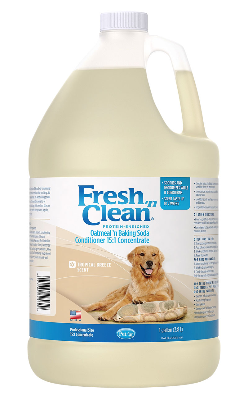 The preferred choice of groomers, Fresh ’n Clean® Oatmeal ’n Baking Soda Conditioner is ideal for dogs with dry, itchy or sensitive skin. Made with 95% plant-derived ingredients, this natural formulation combines the soothing qualities of colloidal oatmeal with the odor-controlling power of baking soda and produces a shimmering coat that’s soft to the touch. Infused with protein and natural conditioning agents, it moisturizes skin and coat and eliminates mats and tangles. The 15:1 concentration saves on shipping costs with more washes per bottle. And the Fresh ’n Clean signature, long-lasting fragrance keeps your dog smelling fresh up to two weeks.