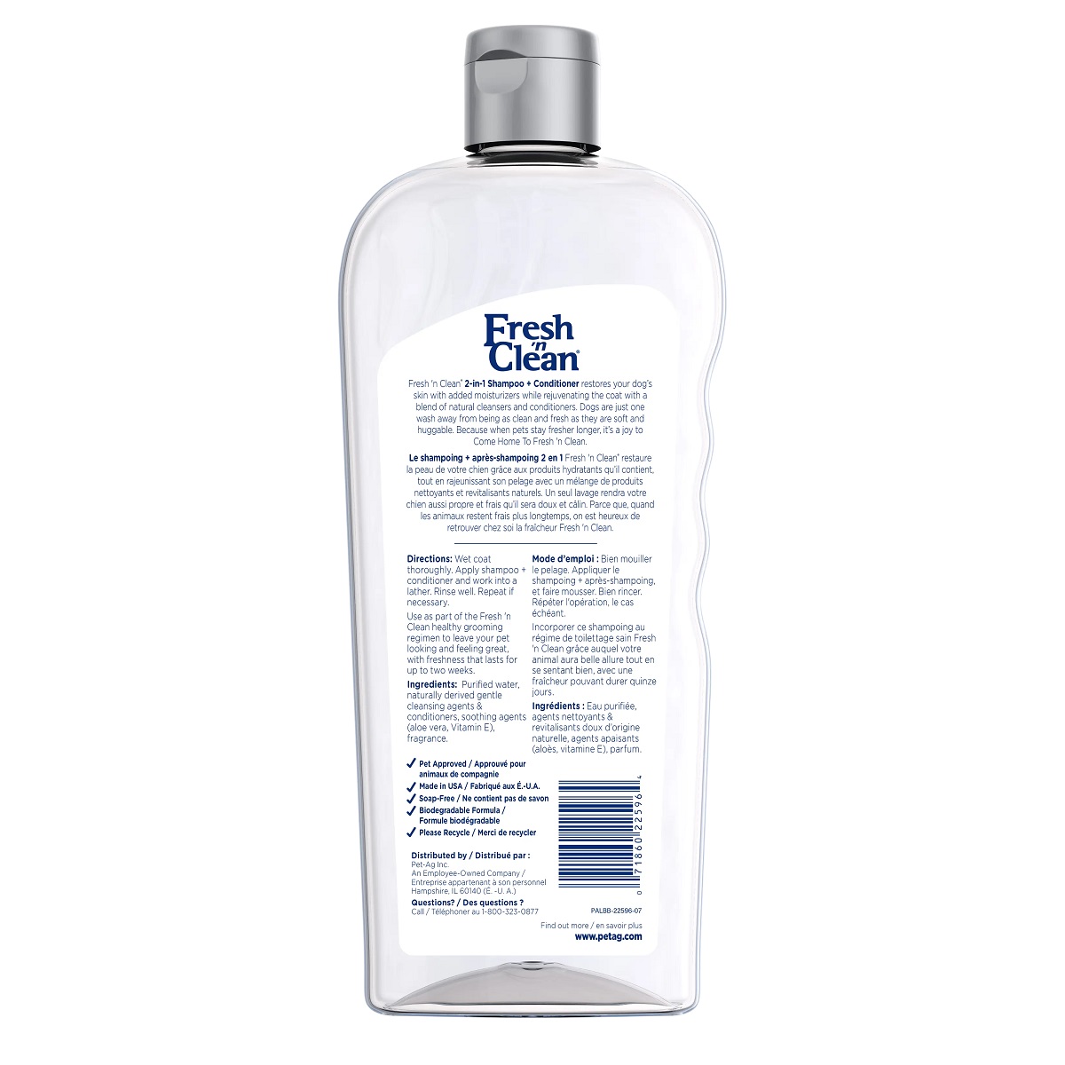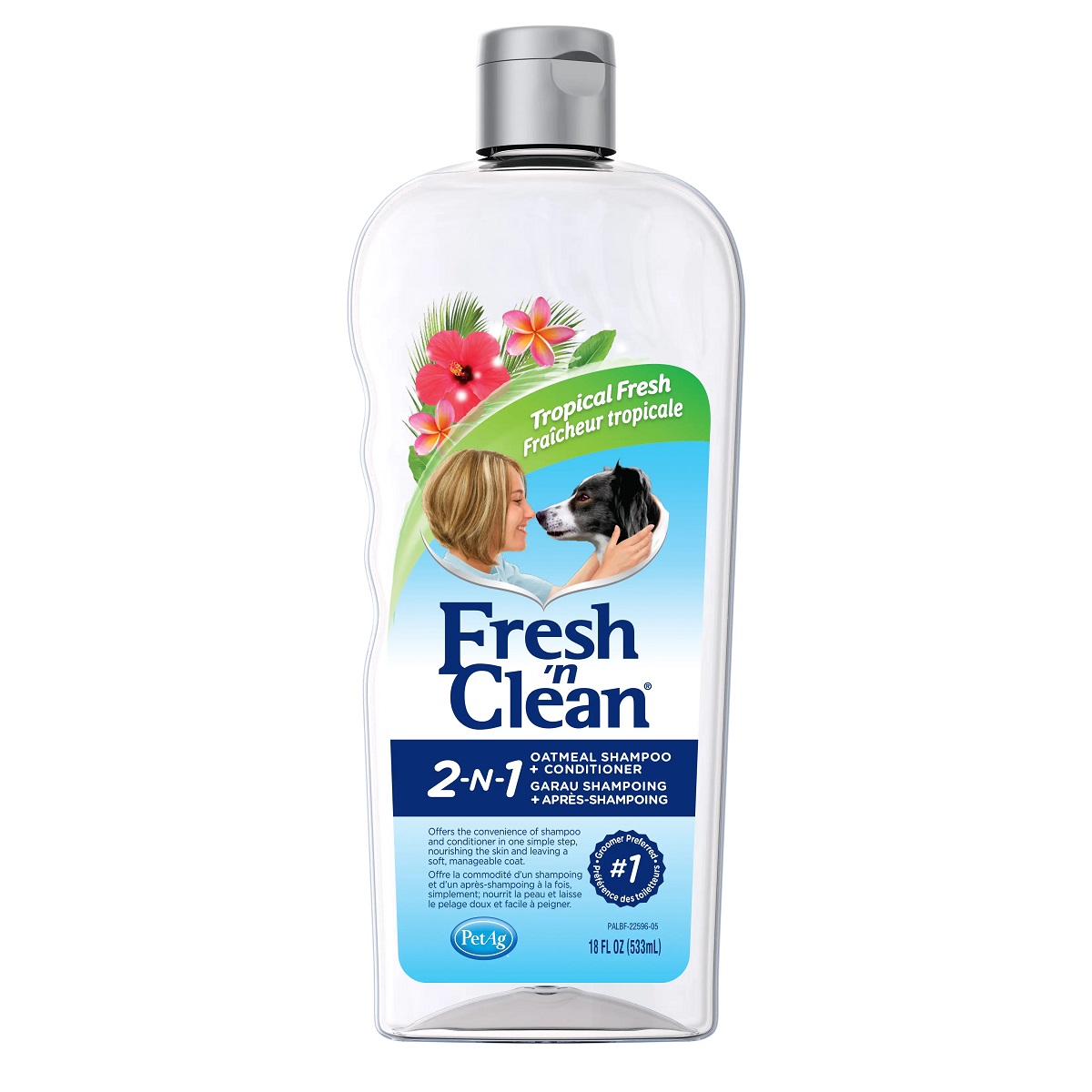 Clean and condition in one easy step with Fresh ’n Clean® 2-N-1 Oatmeal Conditioning Shampoo in Tropical Scent. The oatmeal formulation helps relieve skin irritation and control odor. Delivers a deep clean and also contains vitamin E and Aloe vera to protect and moisturize the skin and coat. The Fresh ’n Clean signature, long-lasting scent keeps your dog smelling fresh up to two weeks.