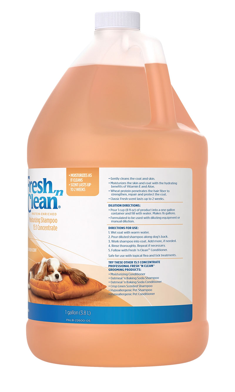 The preferred choice of groomers, Fresh ’n Clean® Moisturizing Shampoo is soap-free and made with 95% plant-derived ingredients. The unique formulation infuses the skin and coat with Vitamin E and aloe extract to lock in moisture and protein to strengthen and repair for a coat that’s shiny, soft, manageable and free of mats and tangles. The 15:1 concentration saves on shipping costs with more washes per bottle. And the Fresh ’n Clean signature, long-lasting fragrance keeps your dog smelling fresh up to two weeks.