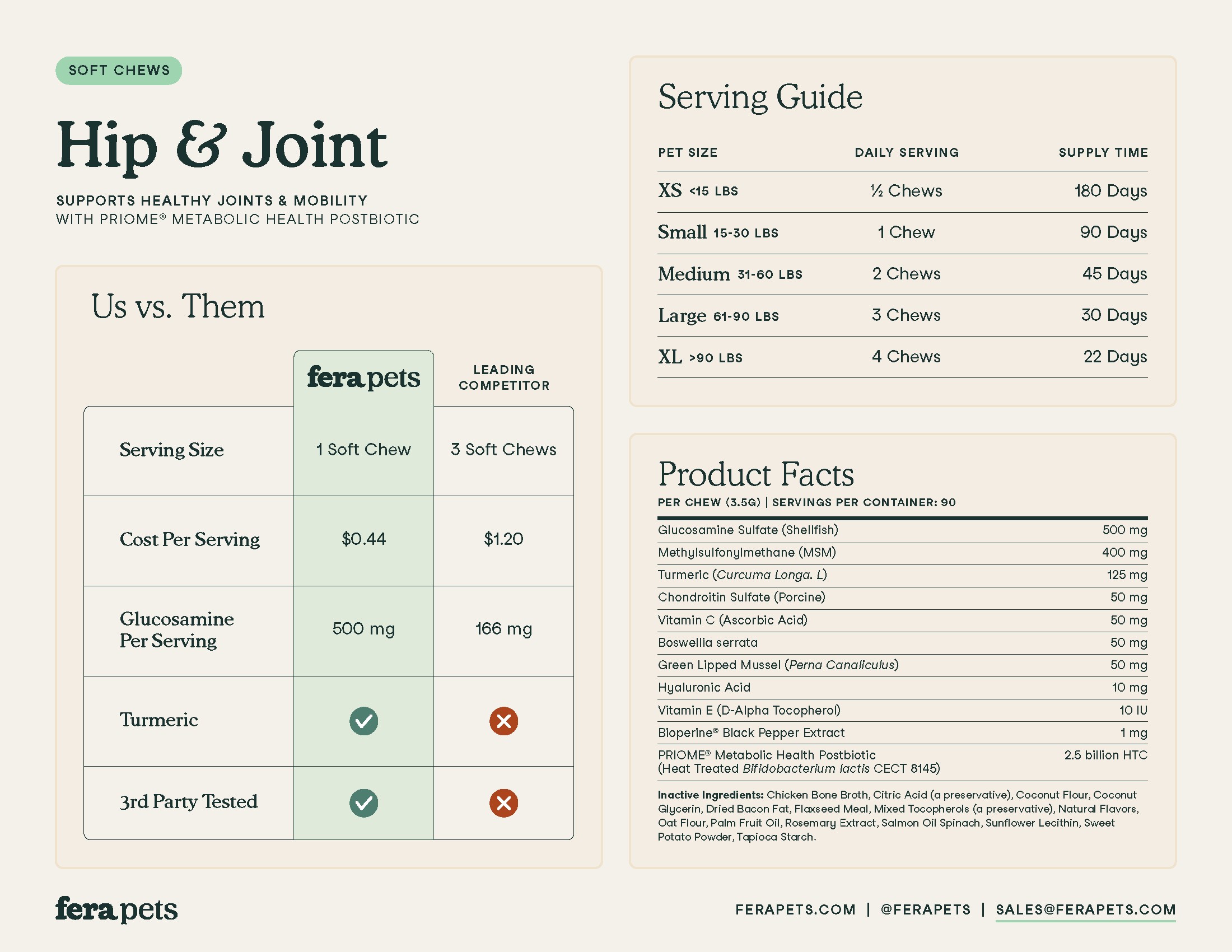 Running, jumping, walking, playing-we want to see our dogs happy and active for as long as possible. That's the sentiment behind Fera's Hip + Joint formula, a proprietary blend of active Eastern and Western ingredients proven to support bone health and joint function for dogs of all sizes-including Organic Turmeric, Glucosamine, Chondroitin, MSM and Green Lipped Mussel. Consider this your dog's superpower for long-term mobility and activity, all in the form of soft chews that they will think is a delicious treat!