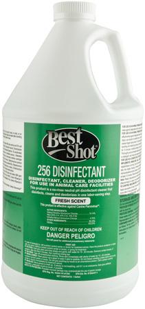 Best Shot Pet Products 256 DISINFECTANT Gallon - Fresh BEST SHOT 256 Disinfectants are the most current and effective animal care facility disinfectants, cleaners and deodorizers on the market today. One gallon makes 256 gallons of cleaning solution Dilutes 1/2 oz. to Gallon For Parvo 2 oz Per Gallon USDA Approved for Animal Quarantine Kills Parvo, H1N1, and more Cleans floors, crates, tabletops, walls, etc. Disinfects and Cleans Clipper Blades and Electric Shears! Deodorizes Carpet and Litterboxes! No Rinsing Necessary Can be used in Auto Scrubbers or with Mechanical Spray Devices Provides area control of staph, salmonella, E. coli, bordetella bronchiseptica, adenovirus, canine distemper, feline picornavirus, HIV-1, infectious bovine rhinotracheitis, rabies, herpes, pseudorabies, respiratory syncytia, streptococcus - even canine parvovirus! Kills viruses, bacteria, fungi, mold and mildew as they clean, disinfect, and deodorize in one labor-saving step. One-step concentrate cleans, deodorizes, and disinfects. Effective against a broad-spectrum of viruses and bacteria, inhibiting mold and mildew, including their odors when used as directed. Safe for Use Throughout Pet Retail Establishments, Grooming Salons, Animal Holding Areas, Veterinarian Clinics, including Food Prep Areas. Effective against COVID-19* - Provides area control of SARS-CoV-2 (the novel coronavirus that causes COVID-19) One gallon makes 256 gallons of cleaning solution (dilute 1/2 oz. to 1 gallon of water) Also kills parvo, H1N1, H3N2, MRSA and more Cleans & Disinfects floors, crates & cages, tabletops, walls, etc. Non-corrosive pH neutral formula disinfects combs, scissors, electric clipper blades, nail trimmers, tweezers and a variety of other salon tools No-rinse formula will not leave unsightly floor residue Can be used in auto floor scrubbers or with mechanical spray devices on any non-porous surface Deodorizes carpet and litter boxes CAUTION: Not to be applied directly upon animals! EPA maintains "List N," which is a list of disinfectants that meet EPA's criteria for use against the virus that causes COVID-19. While surface disinfectant products on List N have not been tested specifically against coronavirus, EPA expects them to kill the virus because they demonstrate efficacy against a harder-to-kill virus or another human coronavirus similar to the one causing COVID-19. This list can be found at: www.epa.gov/ListN.There are many types of coronaviruses and this advisory addresses the specific virus called SARS-CoV-2 that causes the disease COVID-19. Thus the use of the phrase coronavirus in this Advisory refers to SARS-CoV-2.