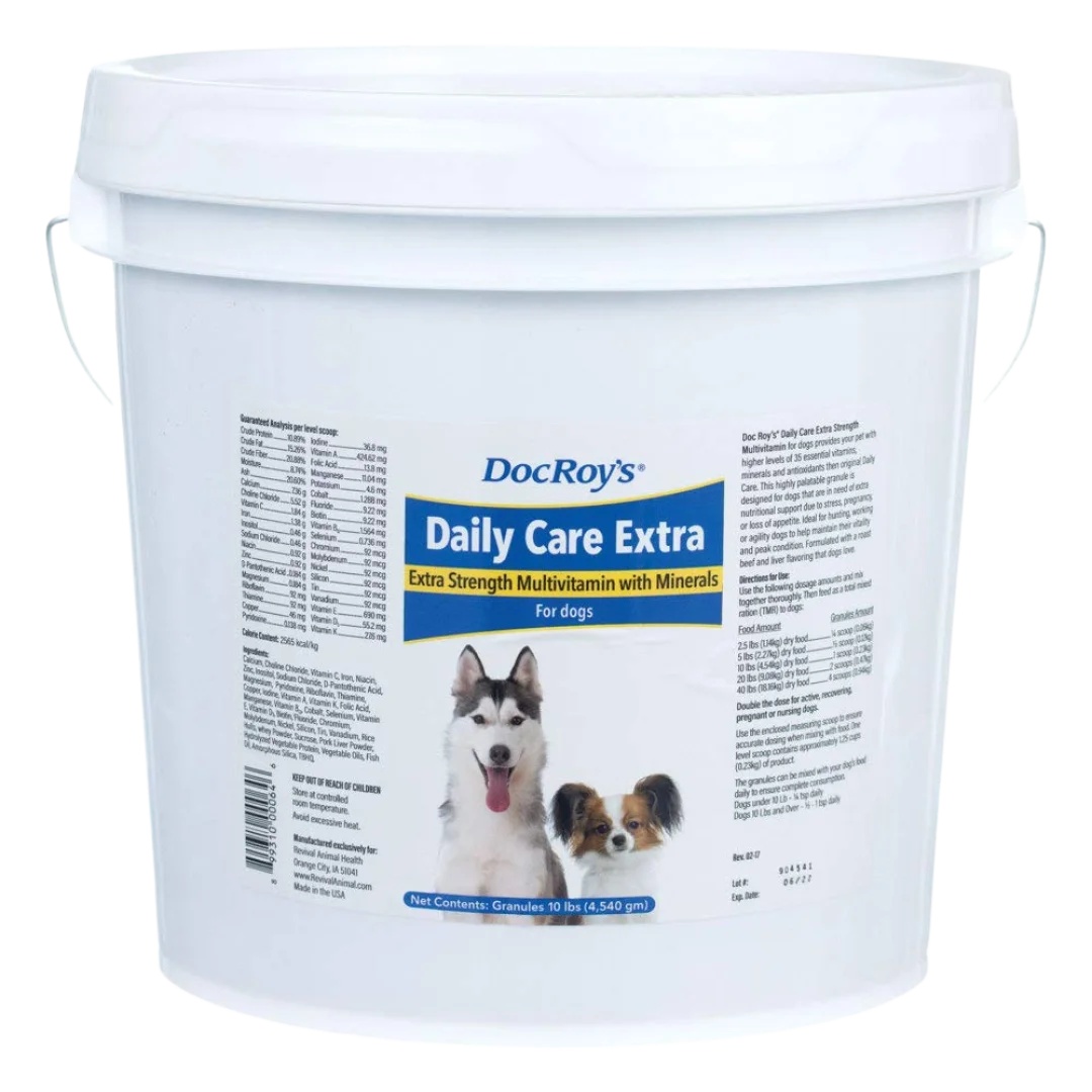 Doc Roy’s Daily Care Extra Canine is an advanced formula provides higher levels of key vitamins and minerals to support performance, recovery, and overall well-being.
