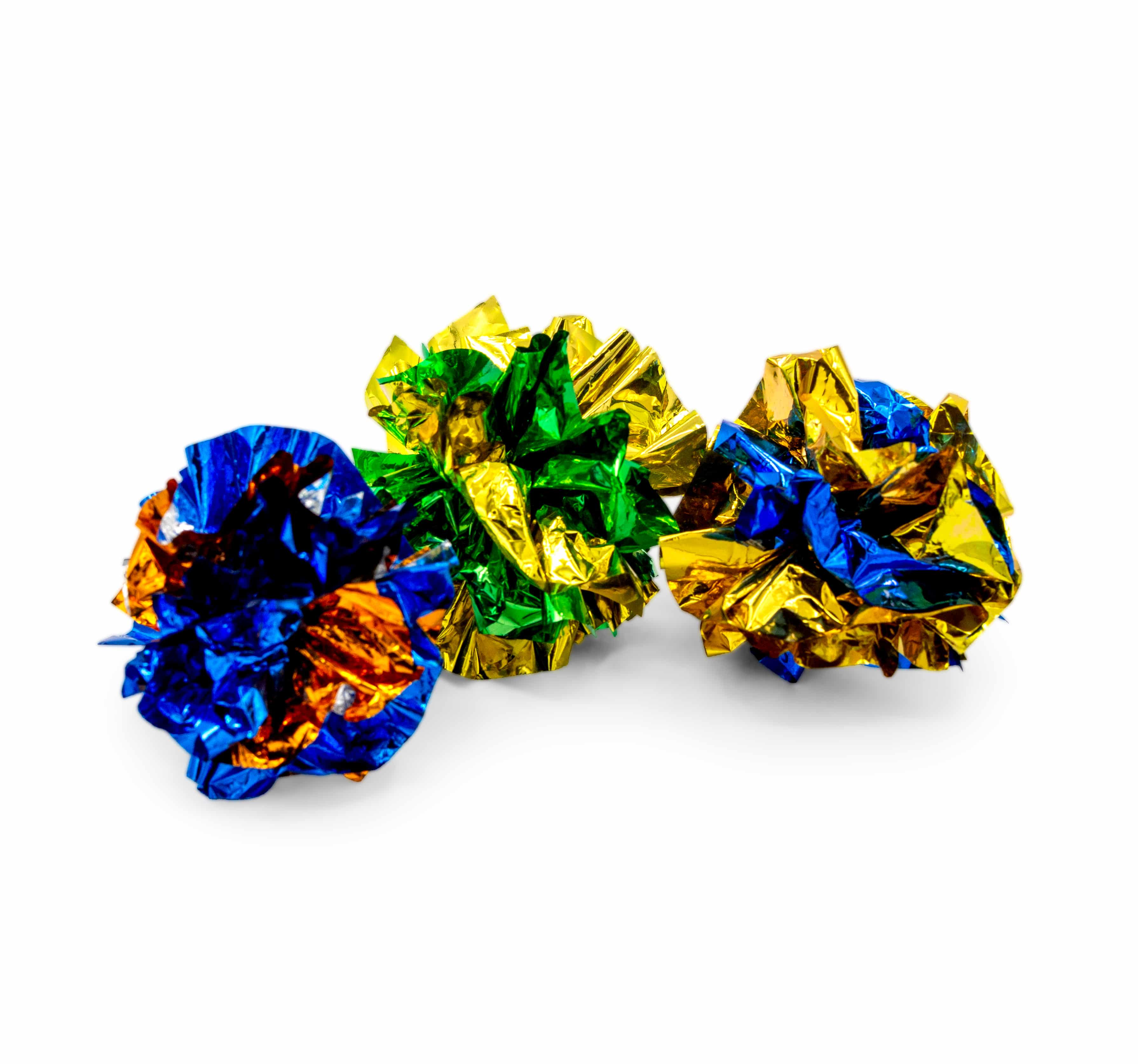Each duo-color, metallic mylar ball is lightweight and makes a satisfying crinkly noise when carried or swatted, enticing your cat’s natural hunting instincts.