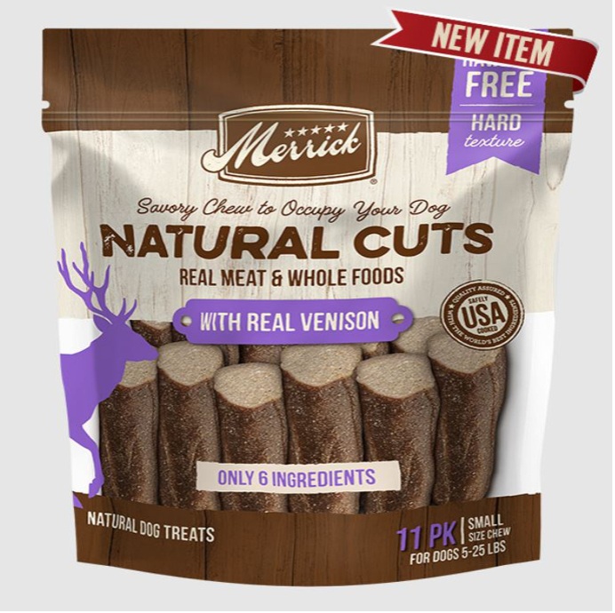 Merrick Natural Cuts are a NEW, rawhide free dog treat designed to occupy your dog with no staining, splintering, or plastic. Made with natural like real venison and whole foods, these savory dog chews contain only 6 simple with an irresistible meaty smell your dog will crave. Made with real venison and whole foods. Hard texture is perfect for tough chewers. Only 6 simple . Contains 11 small size chews.Rice, Vegetable Glycerin, Venison, Whole Grain Sorghum, Natural Flavors, Mixed Tocopherols for freshness."