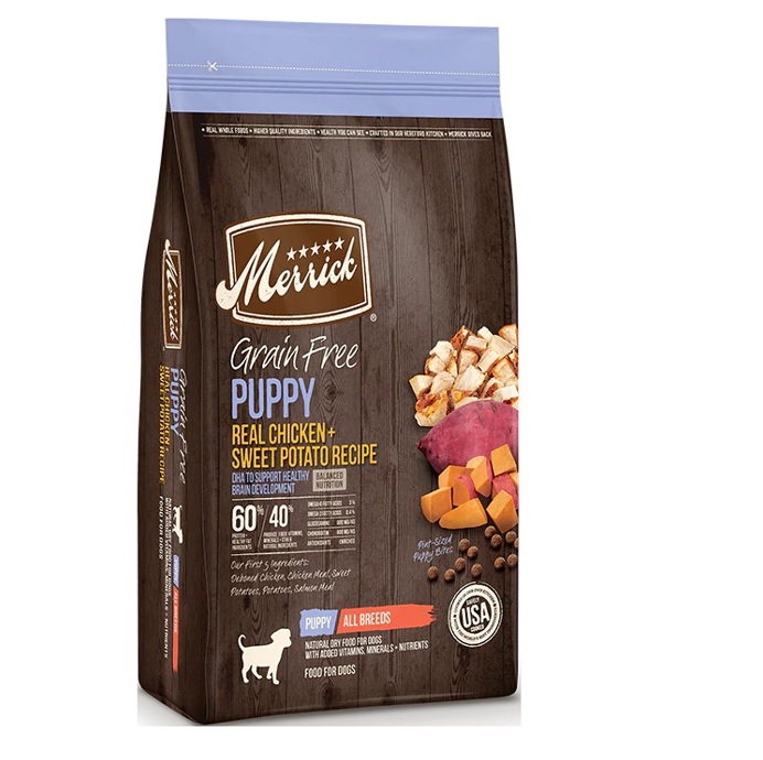 Merrick Grain Free Puppy Recipes provide balanced nutrition with real whole foods sourced from local farmers we know and trust. This natural, grain free formula dog food is ideal for all breeds of puppies and is specifically formulated to support healthy digestion and ensure maximum nutritional benefits with a focus on naturally nutrient rich ingredients to support overall health for all breeds of puppies. Deboned meat is always the first ingredient. This high quality protein helps build and maintain healthy muscle tissue, support healthy skin and coat with omega fatty acids. Added DHA helps support a puppy’s healthy brain development. Features 76% of protein from animal sources. Leading levels of Omega fatty acids support healthy skin and coat and packed with glucosamine and chondroitin to foster joint health. We use real whole foods like apples and blueberries full of vitamins, minerals and antioxidants, plus easily digestible carbohydrates like potatoes and sweet potatoes offer the benefit of sustained energy without upsetting grain-sensitive systems. All Merrick recipes are crafted in our Hereford, TX kitchen and cooked in the USA, in facilities that uphold strict FDA guidelines.