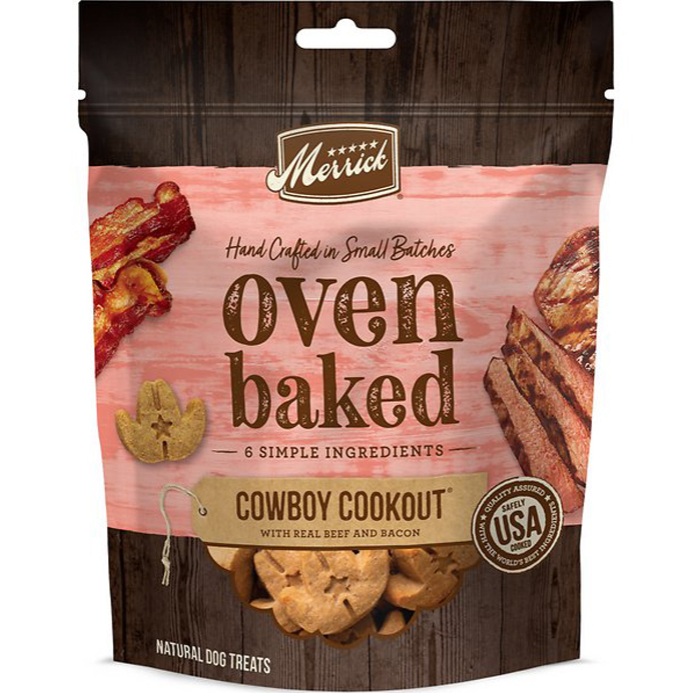 Made in the USA. Oven-baked and hand-crafted in small batches for an irresistible taste and smell. Made with real, whole foods like deboned beef. Recipe contains only 7 ingredients. Free from corn, wheat and soy as well as artificial colors, flavors, preservatives and by-products. If your best buddy can�t resist bacon, treat him to the scrumptious taste of Merrick Oven Baked Dog Treats � Cowboy Cookout with Real Beef and Bacon. These wholesome dog biscuits are inspired by homemade recipes using real ingredients you could find in your own kitchen. Featuring only seven all-natural ingredients, these meaty morsels are hand-crafted and slow-baked for a tasty crunch your pal will love. What�s more, these made-in-the-USA snacks are 100% free of corn, wheat, soy and artificial ingredients. You�ll be the life of the paw-ty with these beefy bites in your bag.