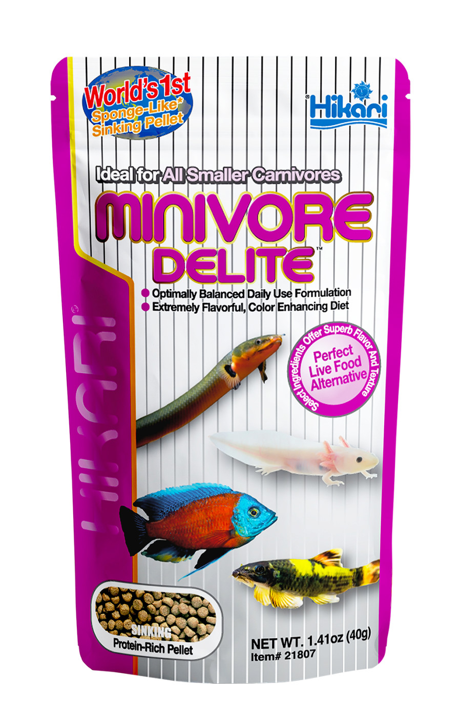 Minivore Delite A scientifically blended nutrient mix specifically for smaller carnivorous fish, especially Axolotyl, who tend to avoid feeding from the top of the aquarium. This highly flavorful diet offers excellent growth and desirable form while improving coloration too!