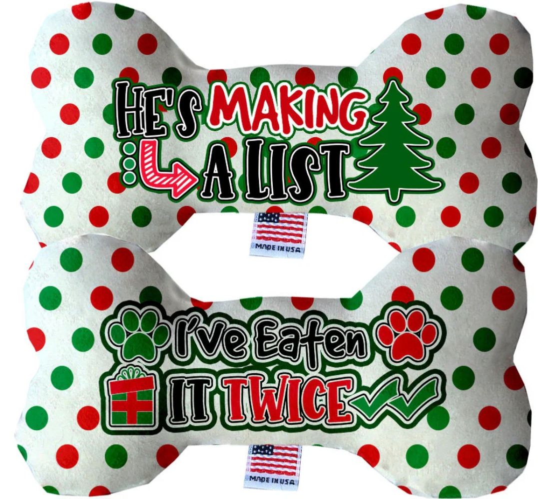 Christmas Pet & Dog Plush Double Sided Bone Toy, "He's Making A List; I've Eaten It Twice"