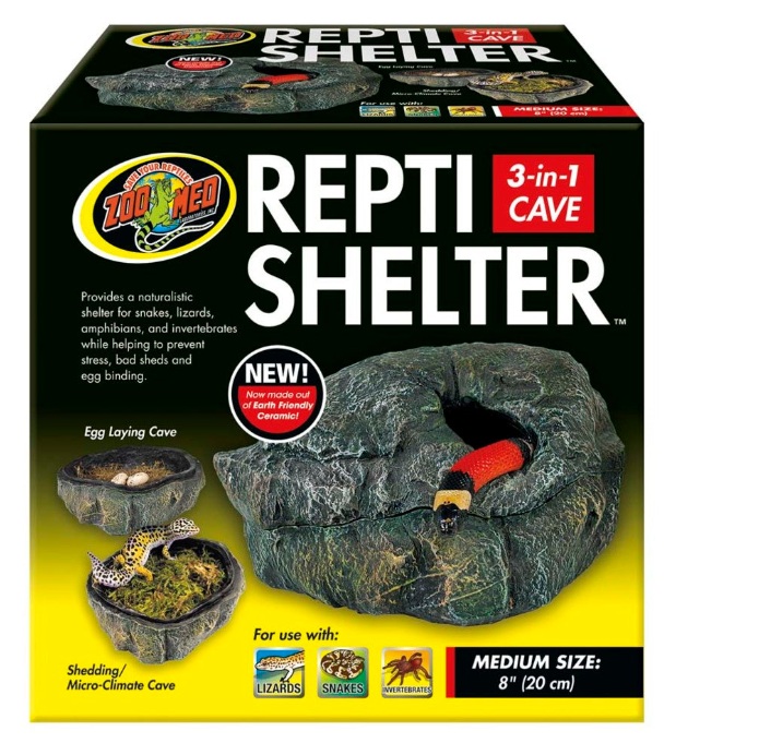 This 3 in 1 cave can be filled with Terrarium Moss or Eco Earth to provide a humid micro-climate for shedding, hiding, or egg laying. Durable resin construction means that it can easily be washed and sterilized, and the removable lid makes it easy to check on your animal or remove eggs. Available in three sizes to accommodate many popular reptile species. br/>Sold in Quantity of: 1