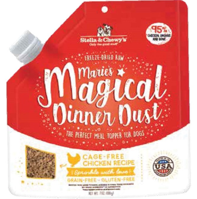 This grain-free, gluten-free and freeze-dried recipe is crafted in the USA with 95% raw, cage-free chicken, organs and bone, plus organic fruits and vegetables like cranberries, spinach, broccoli, beets, carrots, blueberries and more! Simply sprinkle the topper on your canine companions favorite nutritionally balanced and complete meal for an extra helping of vitamins, minerals and other trace nutrients. Your furry friend will love the taste and youll love knowing that there are no added hormones, antibiotics or binders in this delicious Dinner Dust!