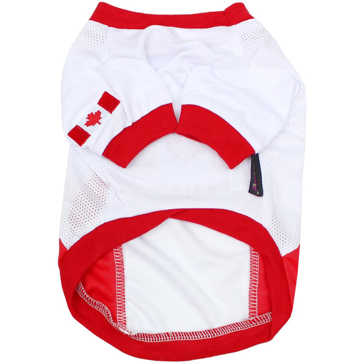 Elevate your wholesale dog apparel collection with our Team Canada Jersey dog shirt. This sporty jersey combines athletic wear with Parisian fashion, featuring bold colors and a modern, fitted cut for a sleek look. Crafted from breathable, lightweight fabric, it ensures your dog stays cool and comfortable during activities. The jersey includes a classic striped pattern, ribbed collar, and trendy Parisian logo, adding a touch of elegance to your pet's wardrobe.