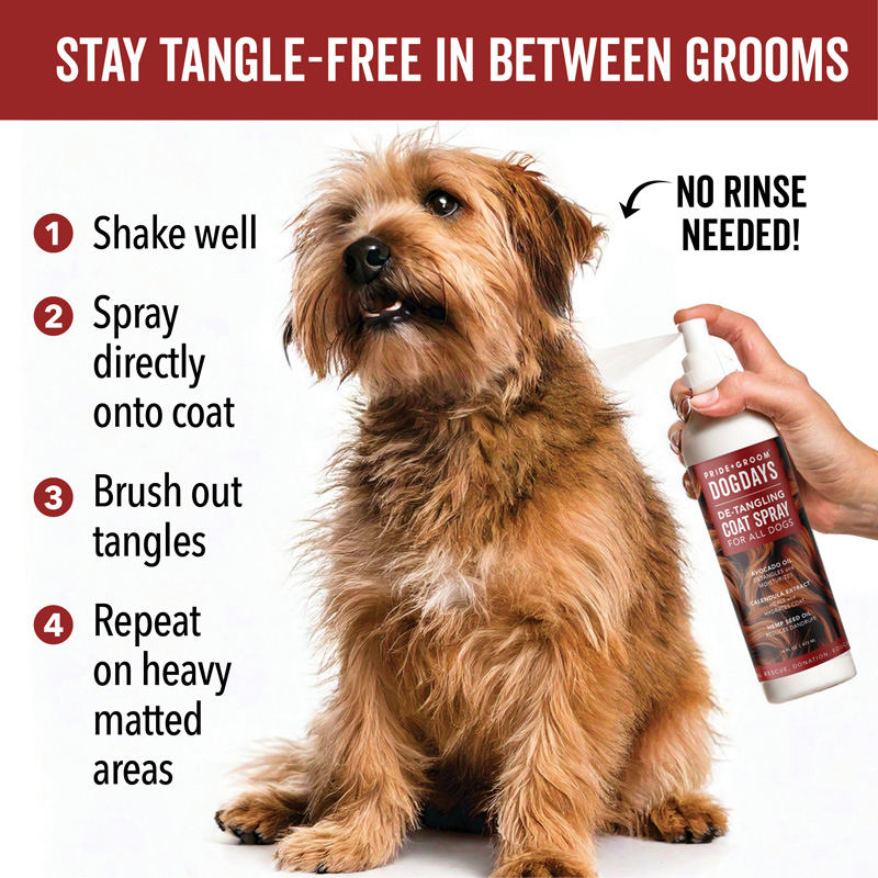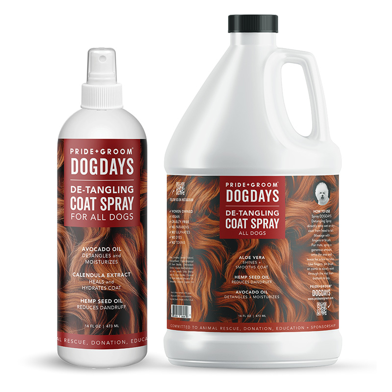 This is the stuff of good hair days. Nutrient rich DOGDAYS Detangling Spray is quick to smooth, detangle and give a silky sheen any coat. Apply wet or dry.