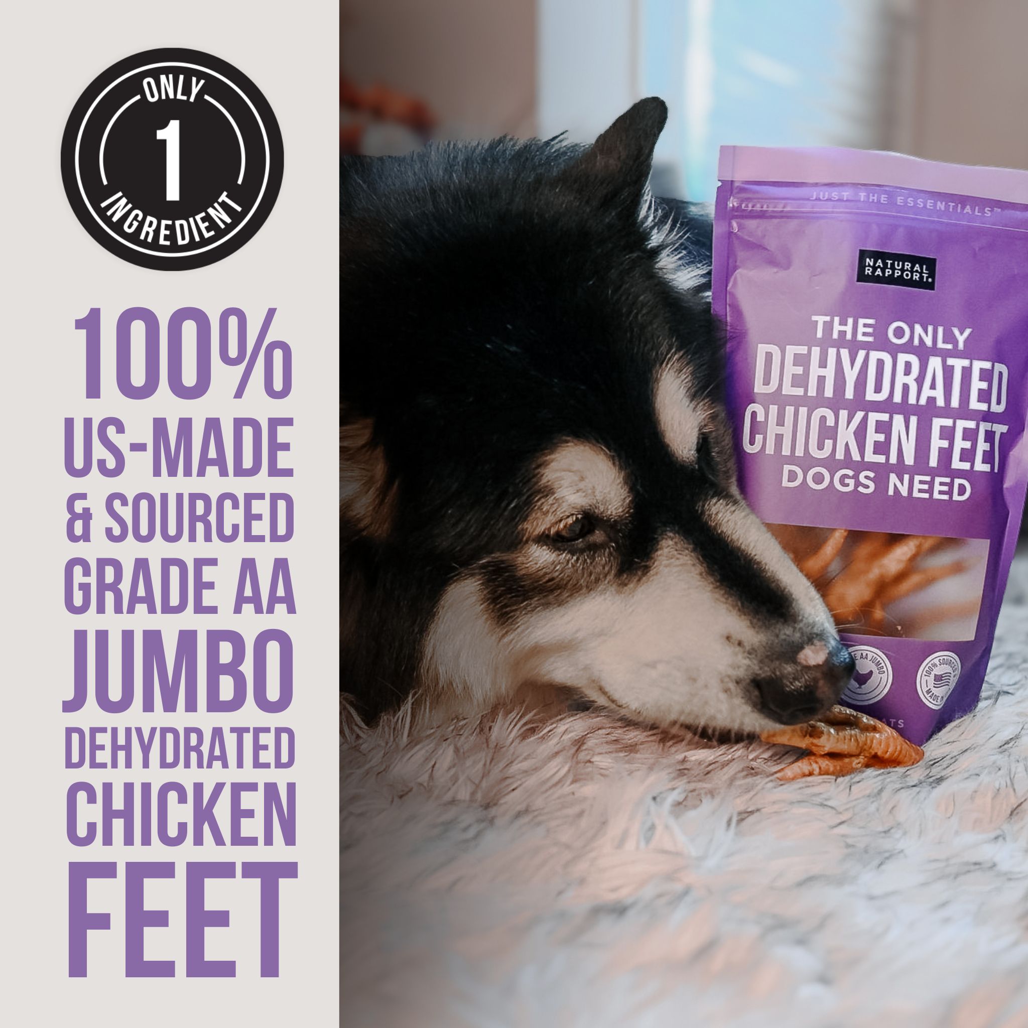 It’s NO SMALL FEAT. We present to you BIG feet. We source our Grade AA, jumbo chicken feet right here in the USA, making them a healthy, delicious chew for your pup that are over twice the size of the competition. While we have all the seals, certifications, and promises as the other guys, what truly makes our Chicken Feet different is this: we source human-grade, all-natural chicken feet and dehydrate them at their peak, so what you get is a powerful, crunchy chew that not only satisfies your dog's need to gnaw, but also helps scrape away plaque and tartar. Plus they’re a naturally rich source of protein, collagen and glucosamine, which are essentials for your dog's joints, skin, and connective tissues. So no more need to scratch around for the perfect snack, these chicken feet are something to crow about!