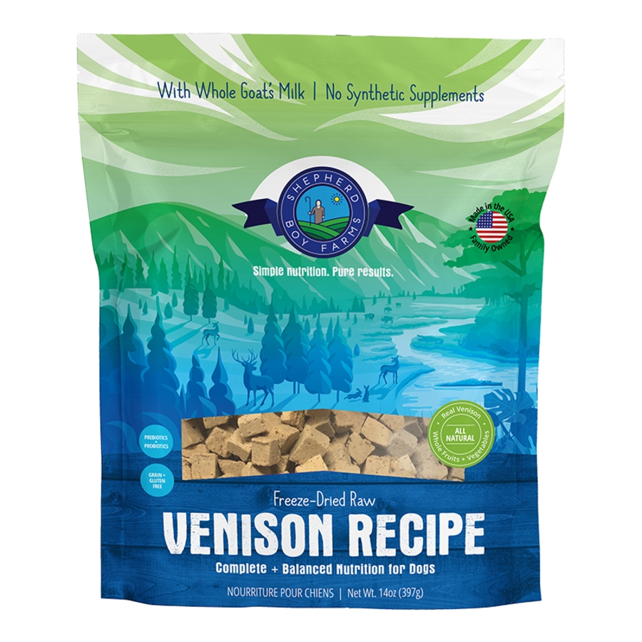 Venison, Ground Flaxseed, Goat Milk, Whole Egg, Organic Sweet Potatoes, Organic Carrots, Organic Spinach, Organic Apples, Organic Blueberries, Organic Cranberries, Cod Liver Oil, Kelp, Chicory Root, Pumpkin Seeds, Organic Turmeric, Organic Ginger, Mixed Tocopherols (Natural Preservative), Enterococcus faecium, Lactobacillus acidophilus, and Lactobacillus casei