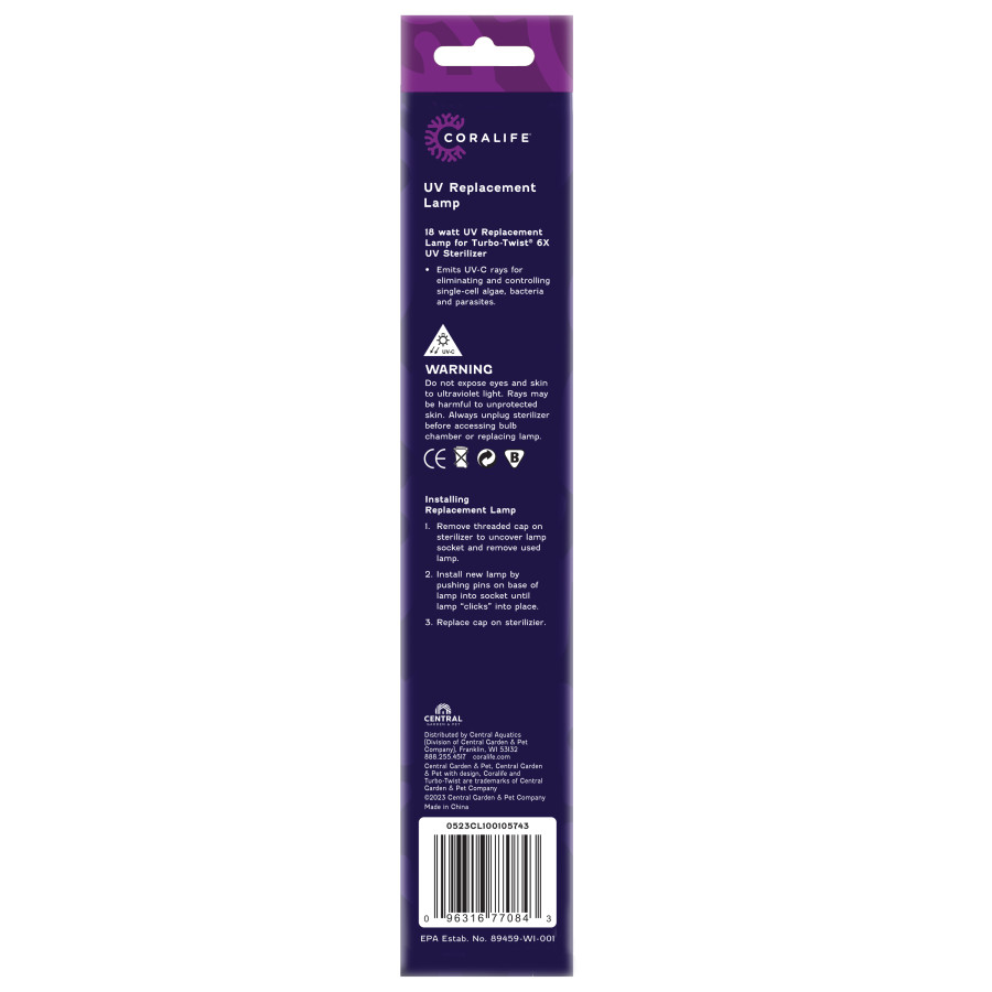 Coralife Turbo-Twist® UV Replacement Lamps are available for your Turbo-Twist® UV Sterilizer. For optimal performance, it is recommended to replace your Turbo-Twist UV lamp after 4,000 hours of operation or every 6 months.