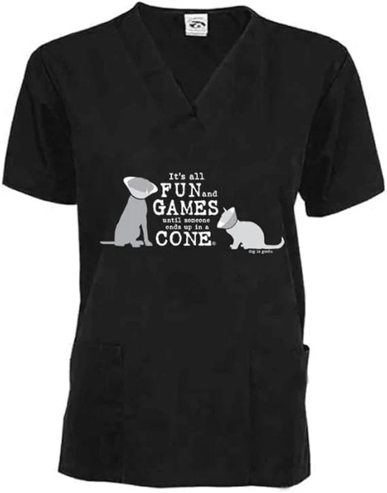Perfect for veterinary professionals, groomers or any animal lover, our "Fun and Games" scrub top in wine delivers comfort, style, and a much-needed dose of humor. With a playful design that reads "It's all fun and games until someone ends up in a cone," this scrub top is sure to get a chuckle from anyone who's been there.