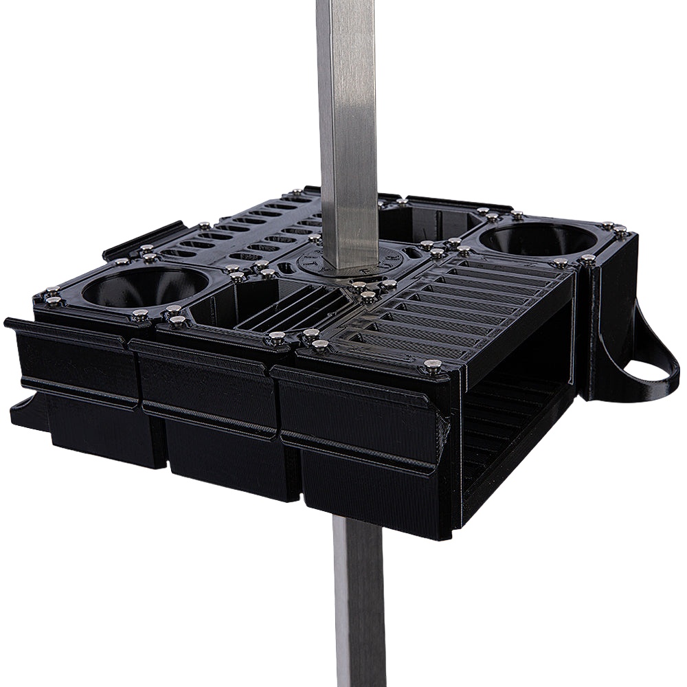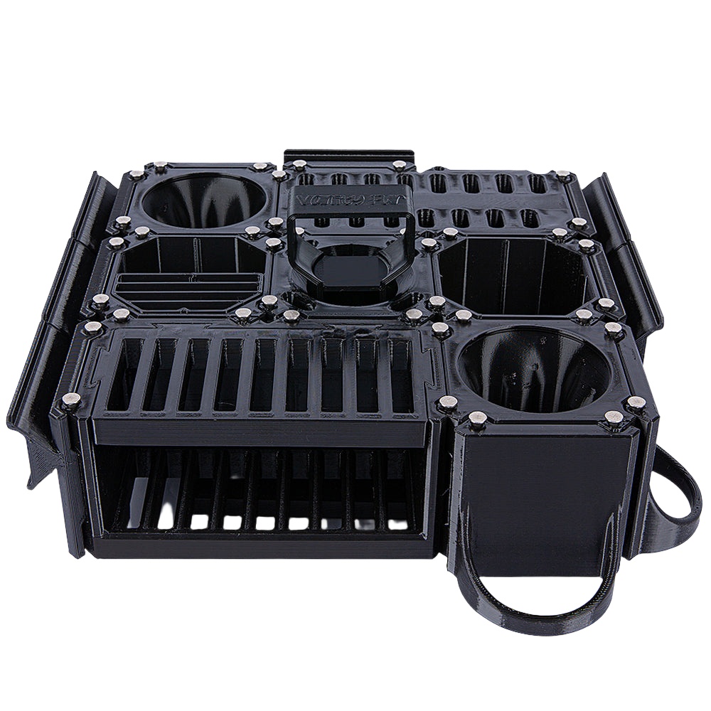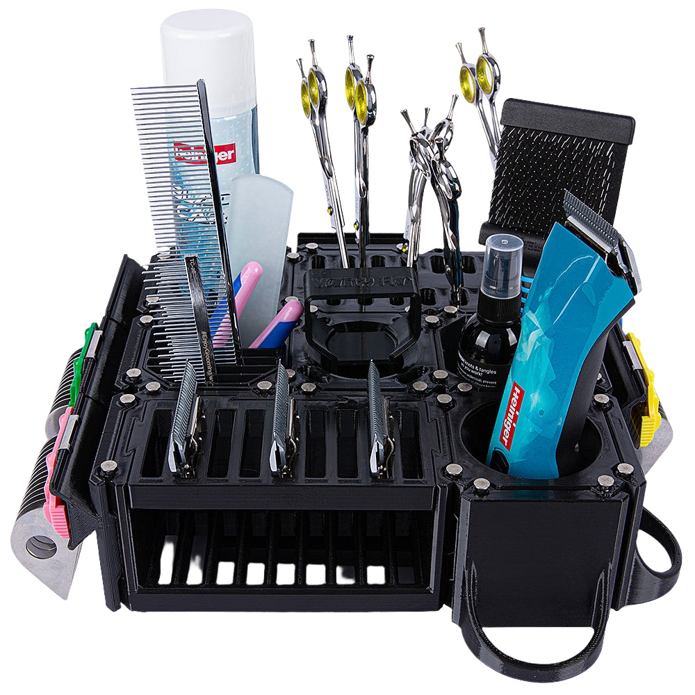 Custom cube caddy having a shear holder that holds upto 15 of your favorite shears, a blade holder that holds 18 blades, the clipper holder, a mini clipper holder which fits a wahl chromado or other 5 in 1 clippers of the same size, 2 open holder for nail clippers, nail grinder, slicker brush, or anything else to keep close, and comb holder carry upto 6 comb attachment, and 2 hanger for brush or extra grooming tools