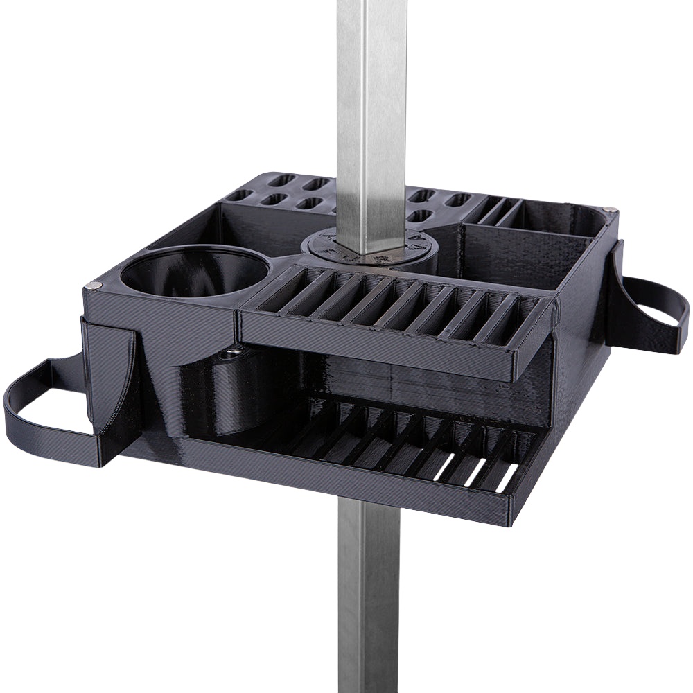 Mini cube caddy having a shear holder that holds 12 of your favorite shears, a blade holder that holds 16 blades plus 2 more blades in the clipper holder, a mini clipper holder which fits a wahl chromado or other 5 in 1 clippers of the same size, 2 open holder for nail clippers, nail grinder, slicker brush, or anything else to keep close, and another 2 hangers on opposite corners to hang your spray bottles, brushes, or extra grooming tools
