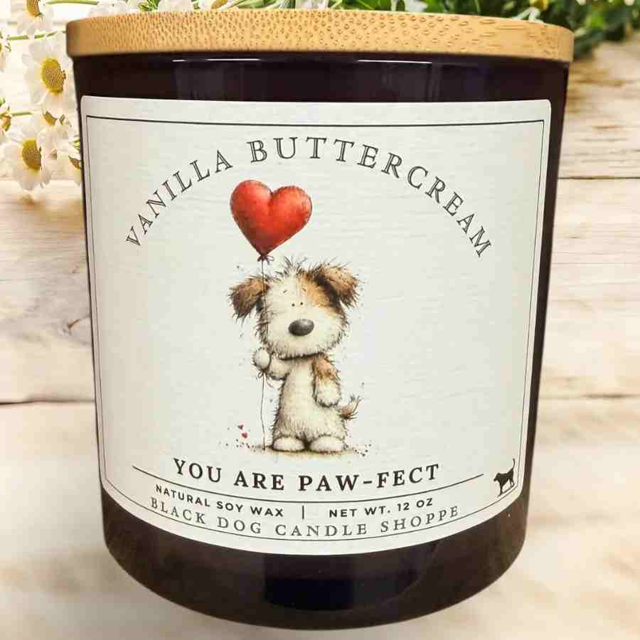 Cute Double Wick candle in transluscent grey vessel. Vanilla Buttercream scent. Textured paper label with adorable dog holding heart shaped balloon.