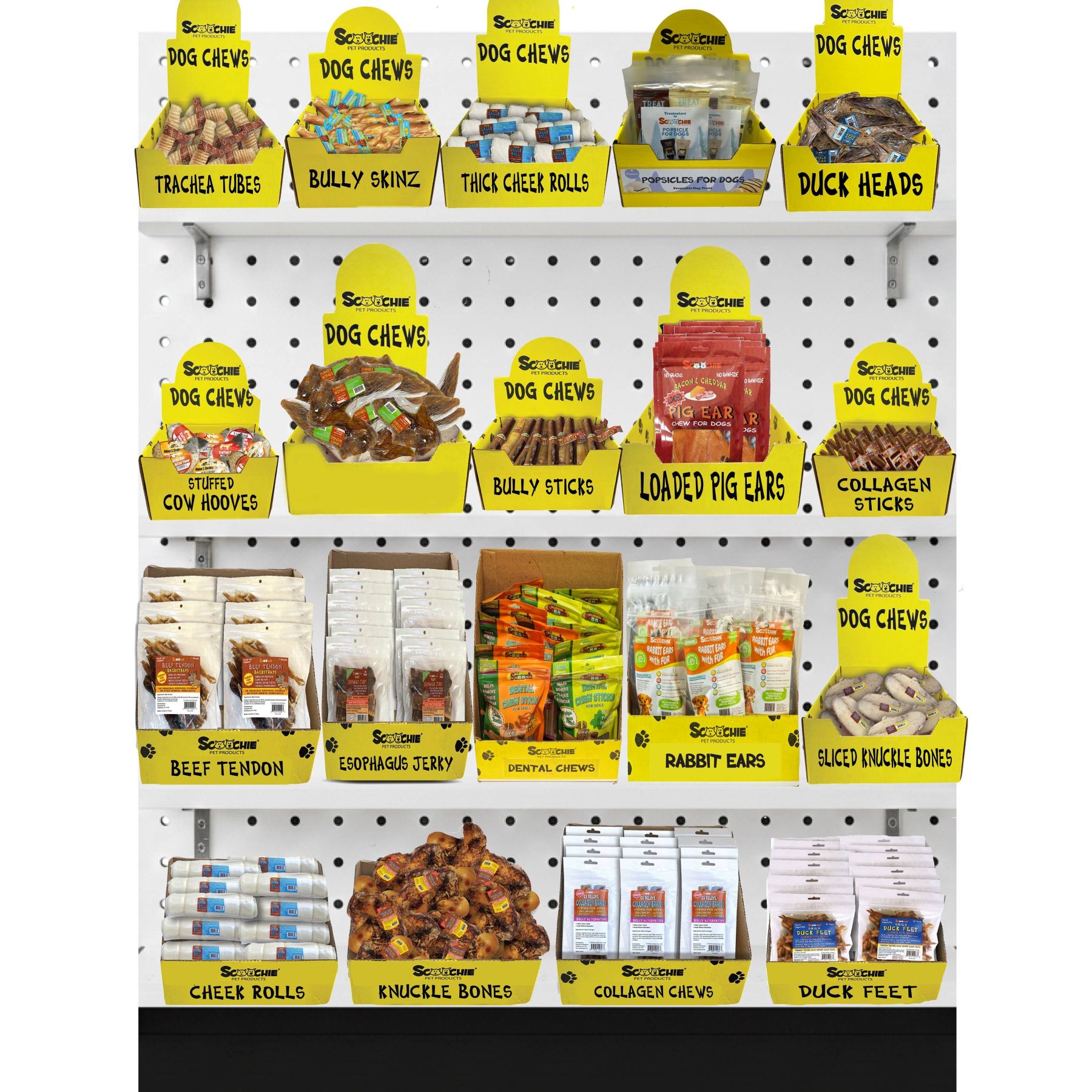 Showcases a variety of Scoochie dog treats customers can choose from, featuring popular flavors and treat styles. The panel makes it easy to compare options and find the perfect reward for any dog.