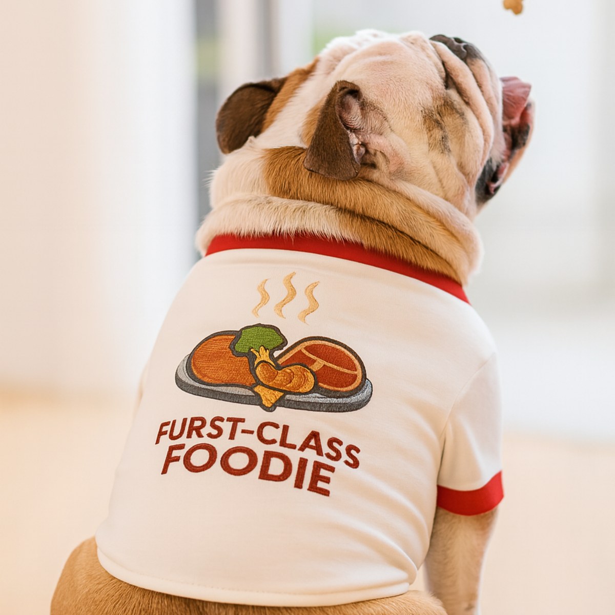 The Furst Class Foodie dog shirt is a deliciously fun way to showcase your pup’s personality. Featuring a playful hotdog graphic and bold “Furst-Class Foodie” embroidery, this food-themed t-shirt is a hit among dogs who love to make a statement. Made from a soft, breathable cotton-poly blend, this shirt is as comfortable as it is comical.