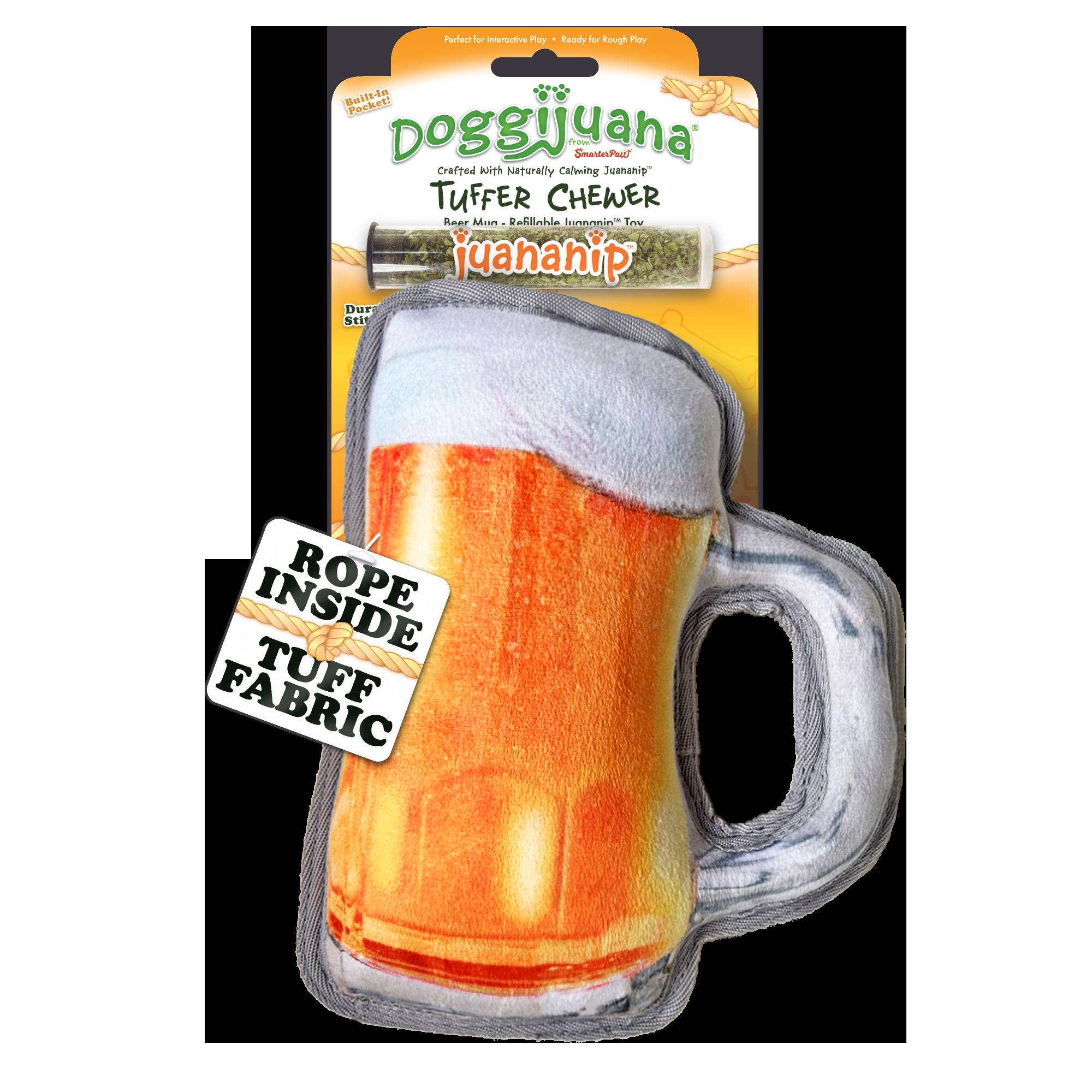 Raise a glass (or a paw) to playtime with the Doggijuana® Tuffer Chewer Beer Mug! Designed for medium and large breeds who are light to medium chewers, this frothy fun toy is built with tuff fabric, a rope core, and a refillable Juananip® pocket for extra excitement. Perfect for chewing, tugging, and tossing, it’s durable enough to handle your big pup’s playful spirit. This beer mug is the ultimate toast to fun—minus the spills!