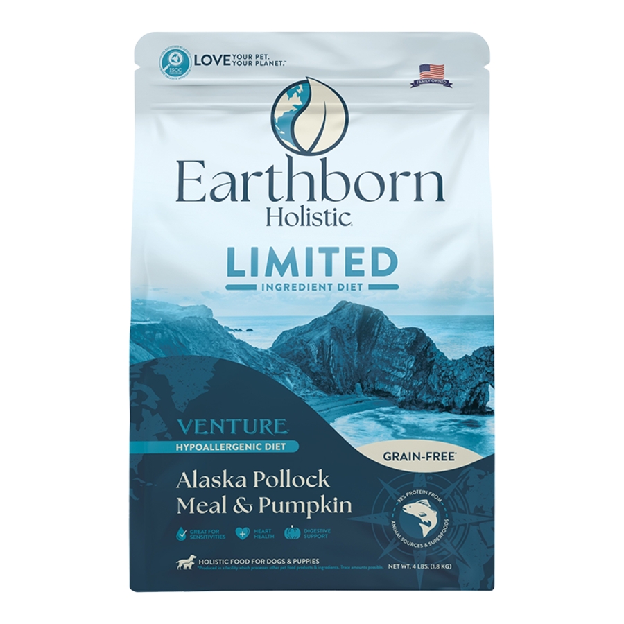 Pamper your pooch while addressing his skin or digestive sensitivities with the lip-smacking taste and exceptional nutrition of Earthborn Holistic Venture Alaska Pollock Meal & Pumpkin Limited Ingredient Diet Grain-Free Dry Dog Food. Your pup will dash to his bowl for the irresistible flavor of fresh fish, and with no grain or gluten, corn or soy, fillers or additives, you’ll love knowing that your furry best friend is eating an exceptional food made with superior ingredients. Meticulously formulated to satisfy all of your dog’s nutritional needs, this limited ingredient diet is also a rich source of protein, fiber and the other essential nutrients he needs for superb digestion, a lustrous skin and coat, and optimal overall health.