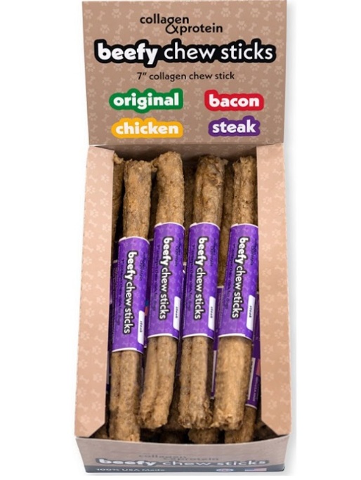 Our Beefy Sticks are absolutely delicious and packed with collagen, a highly-digestible ingredient known to promote healthy skin, coat, joints, nails and teeth. They’re made from 100% traceable USA cattle and are wheat, sugar, preservative and GMO free.