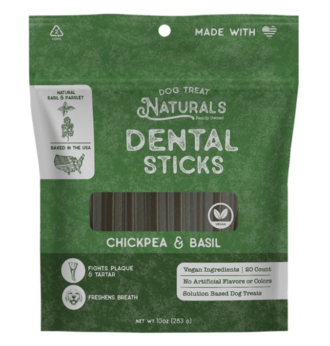 CHICKPEA & BASIL DENTAL STICKS, 10OZ (20CT) - Explore treats your furry friends will absolutely love. We've thoughtfully crafted our Dental Sticks with wholesome and nutritious ingredients and a unique shape that help prevent tartar and plaque build-up and freshen up that doggy breath with mint and parsley. Dental Sticks are a healthy addition to your dog's daily diet and in between veterinarian visits. DOG TASTEBUD APPROVED: Not only will your dog love these treats, but you can feel good about them knowing they're natural and even healthy for your pup. INGREDIENTS: Chickpeas, Pea Flour, Brewer's Yeast, Coconut Glycerin, Barley Flour, Apple Pomace Powder, Blackstrap Molasses, Agar, Salt, Parsley, Mint, Citric Acid, Mixed Tocopherols.