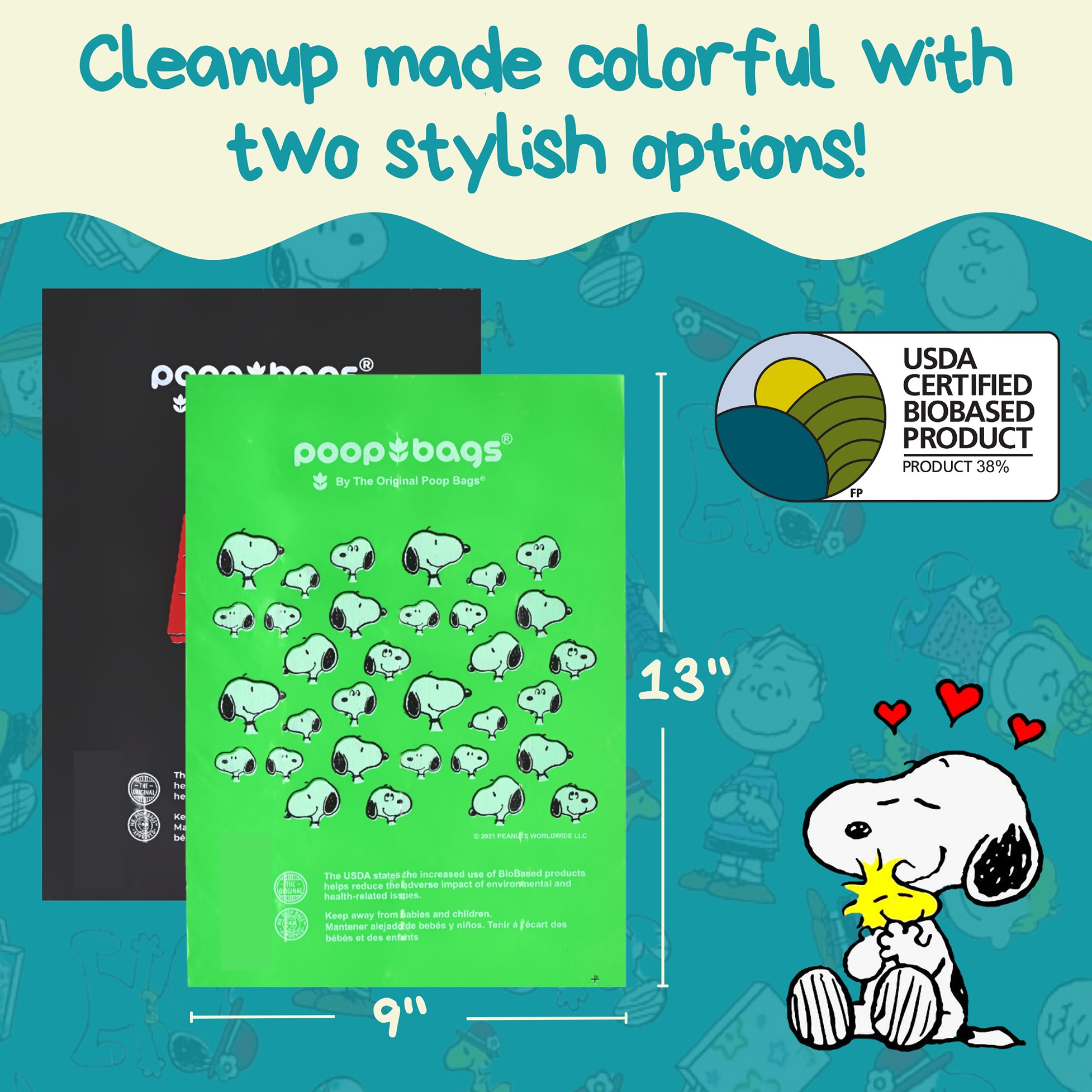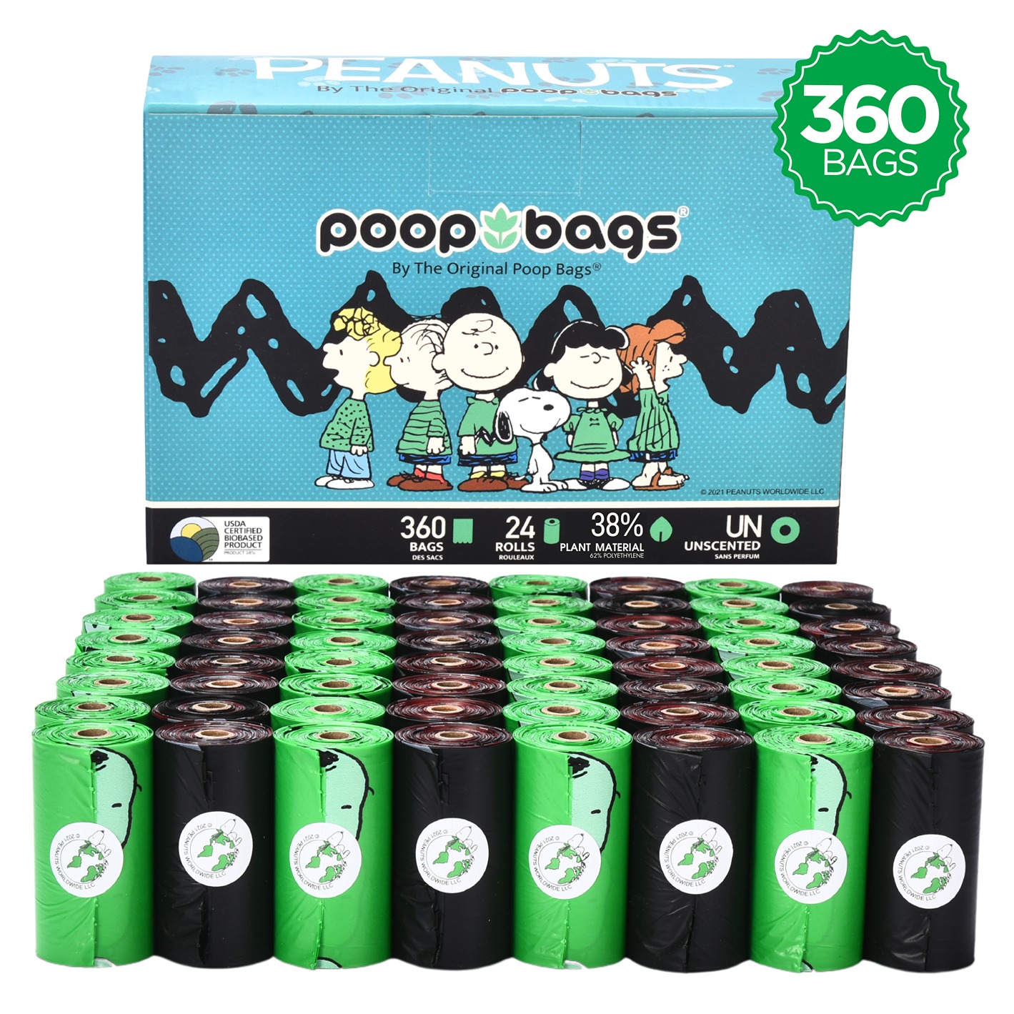 Officially licensed Peanuts® poop bags. Iconic Snoopy design, unscented, leak-proof, and compatible with standard dispensers. Built for strong retail sell-through.