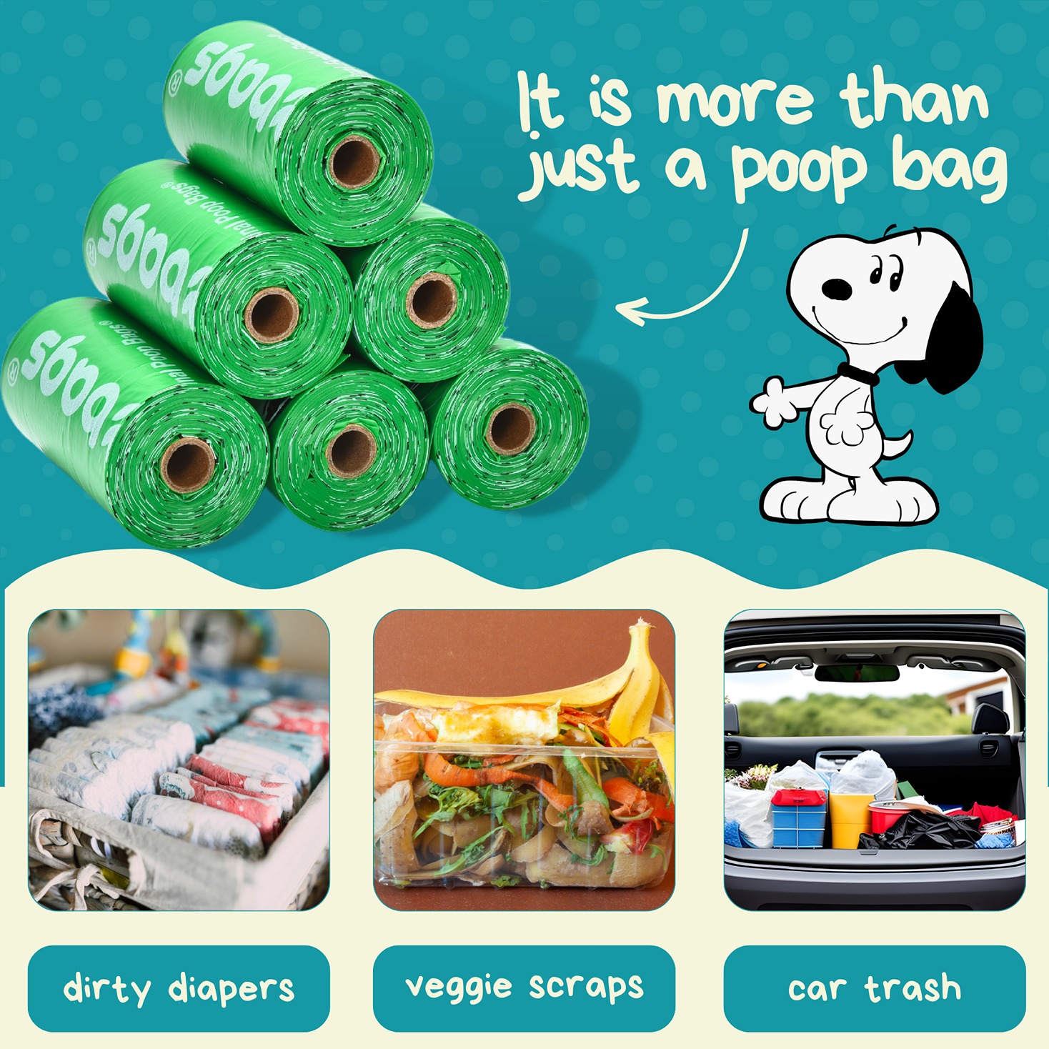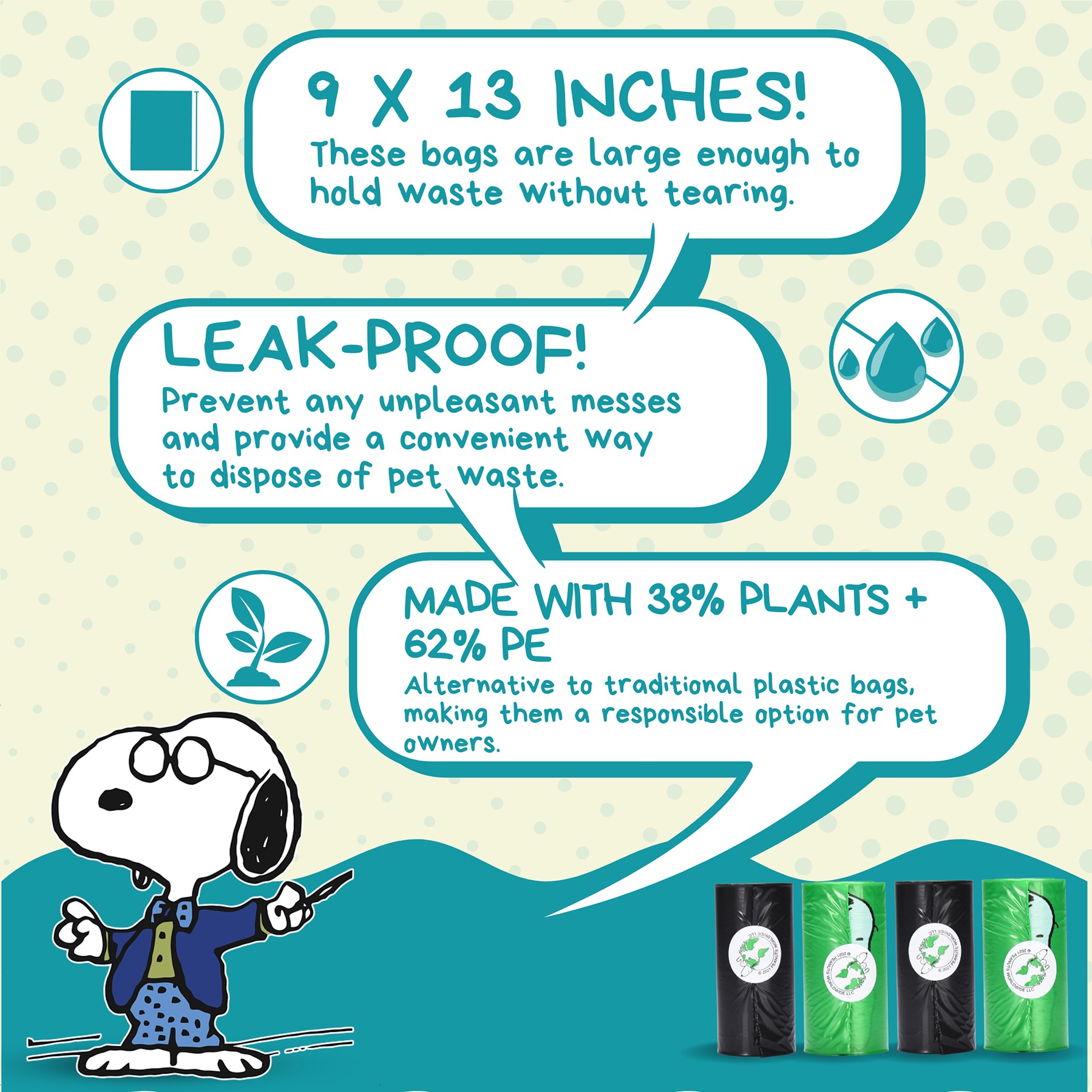 ✔ These bags are made with 38% biobased materials for a responsible choice. ✔ They feature Snoopy and the Peanuts gang for a fun touch. ✔ The bags fit most standard dog waste bag dispensers (sold separately). ✔ Every purchase supports the rescue and care of elephants in need.