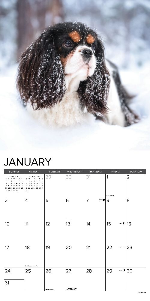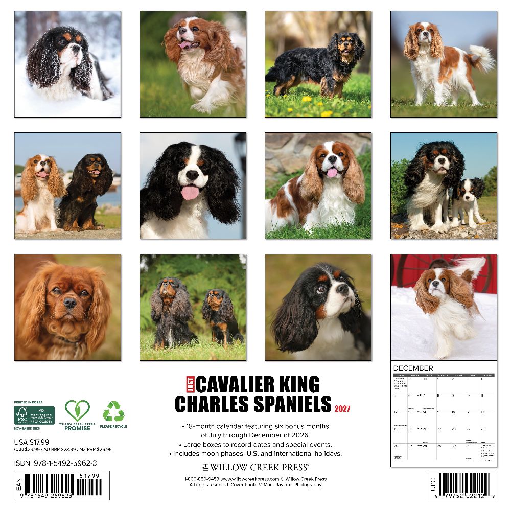 REGAL COMPANIONS – Celebrate the grace and gentle spirit of the beloved Cavalier King Charles Spaniel with this 2027 calendar, featuring stunning portraits of these affectionate and elegant dogs. Their sweet expressions and silky coats make every month a royal delight. PLAN IN STYLE – Stay organized with our 12” x 12” monthly wall calendars, the perfect fit for any home or modern office. Six bonus months from July to December 2026 provide a smooth transition into the new year, while large monthly grids from January through December 2027 offer ample room for jotting notes and planning. PICTURE-PERFECT QUALITY – Printed with soy-based inks on high-quality FSC-certified paper, our large format 12” x 12” wall calendars offer smooth writing, crisp readability, and vibrant imagery, making them a welcome accent to any space. EFFORTLESS SCHEDULING – Enjoy ample space to note events, track appointments, and easily organize activities. Manage busy schedules at-a-glance with clearly noted moon phases (CST), holidays, and observances.