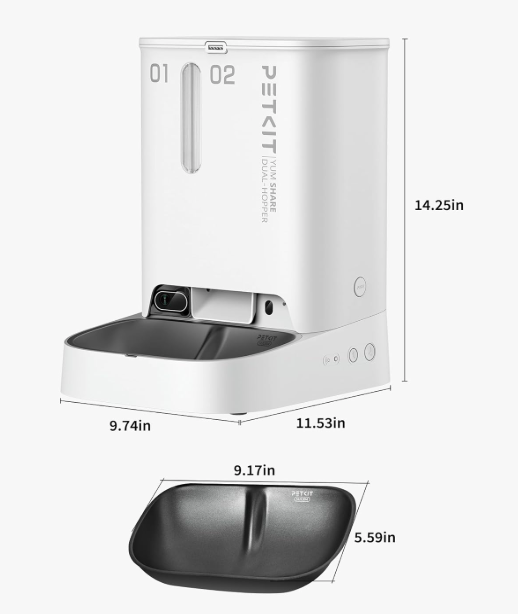 YumShare Dual-hopper pet feeder with Camera. With 1080P high resolution and 140° wide viewing angle camera, automatically detects and analyzes the remaining food in the food bowl to prevent food stacking. With a built-in 940nm infrared LED fill light and high-sensitivity sensor, the camera intelligently switches to night vision mode. This PETKIT automatic cat feeder is 2.4GHz WiFi-enabled, allowing you to program and monitor your pet's meals anywhere anytime via the PETKIT App. Separately customize feeding time and portions for each hopper via the smart app.