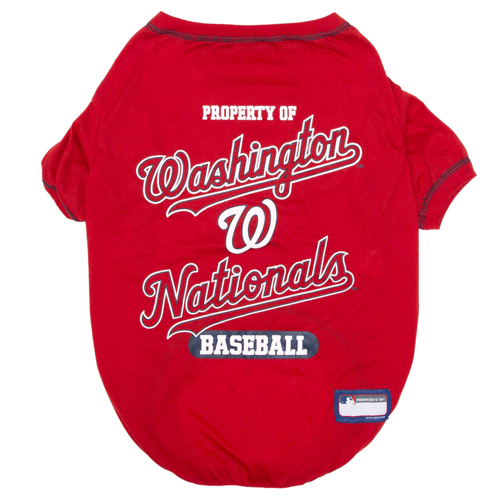 MLB dog tee shirt features Washington Nationals team logo. This tee is made of 100% cotton and is machine washable.