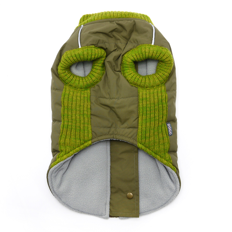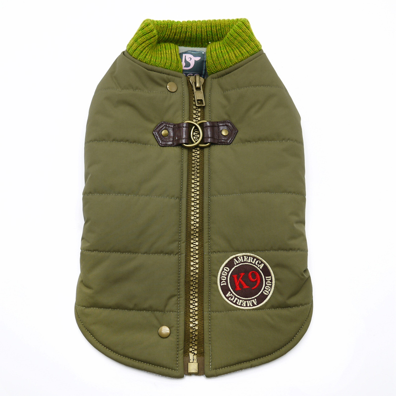 Warm insulated design with top zipper closure,marled sweater trim and army patches. Size XS to XL has D- Ring design for leash attachment. NOTE: Size 2XL to 4XL come with buckle design.