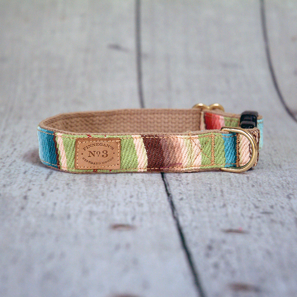 All of our accessories are made on lightweight soft cotton webbing. We use different fabrications, sourced from all over the world, accompanied by solid brass fittings and an adjustable collar. All of our products are handmade and assembled in San Francisco, California.
