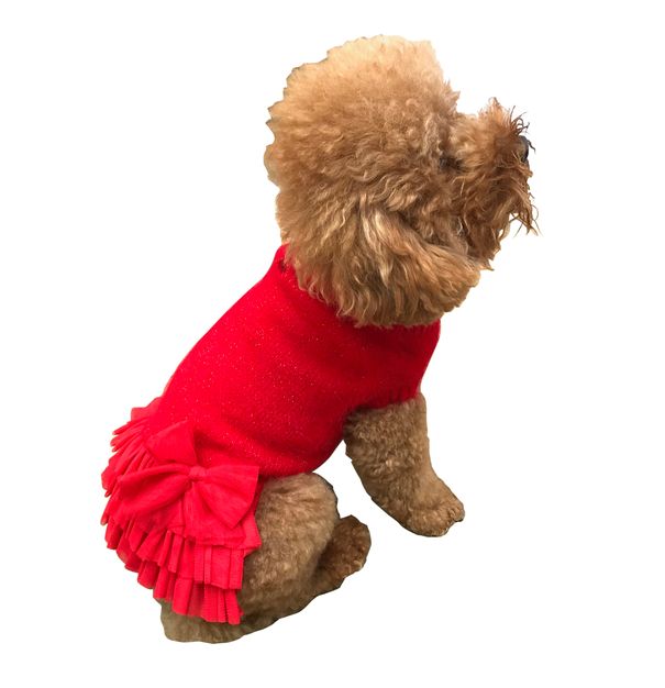 The Dog Squad's Frilly Tutu Sweater Dress is a one of a kind Designer tutu and sweater in one. Stay warm in the winter while looking fashionable! A triple layer tutu skirt adorns this adorable sparkly angora sweater. A leash hole is provided for maximum comfort. Available in blush, red and black. Hand wash, lay flat to dry or airfluff. No heat, no iron, or dry clean.