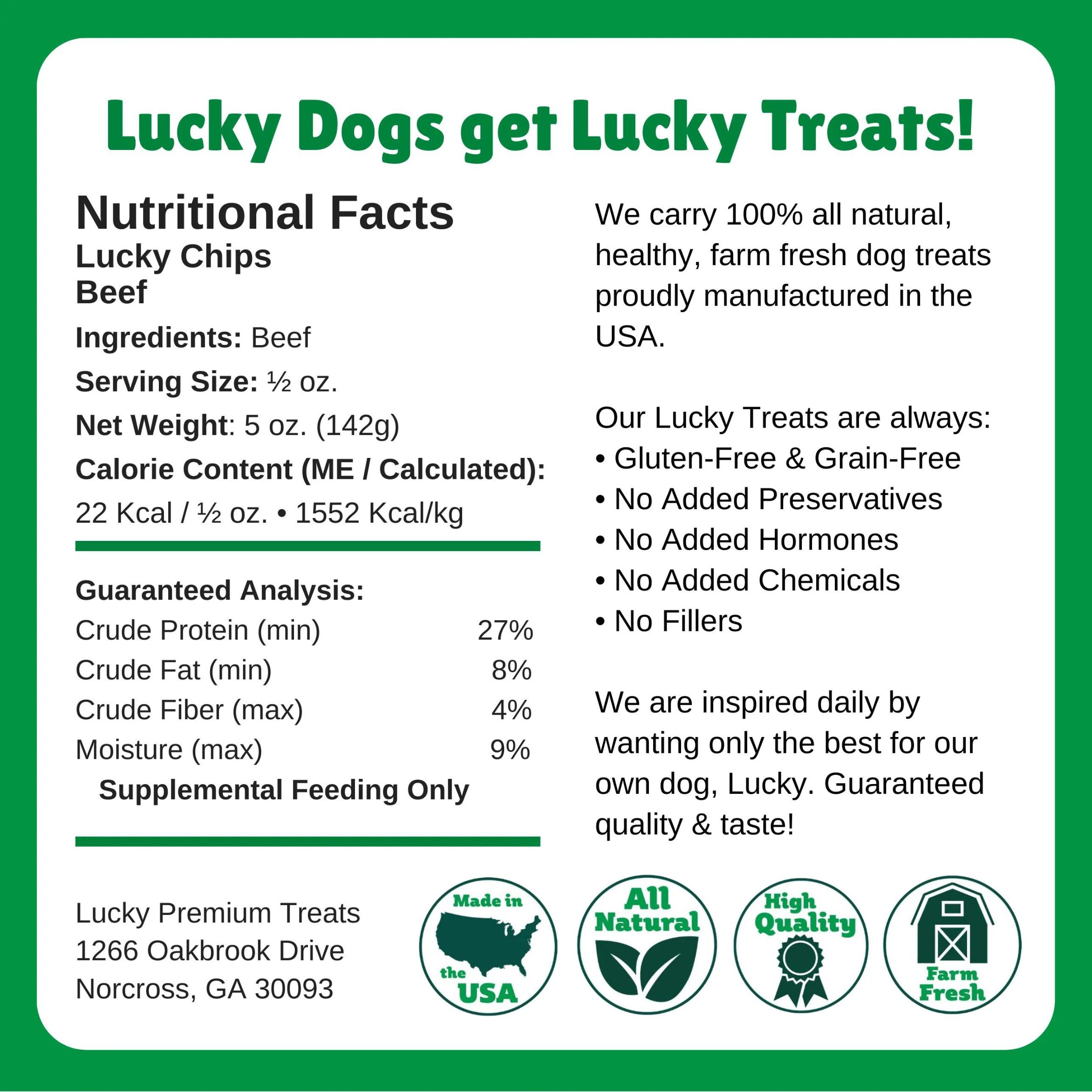 Dogs of all sizes love the savory flavor and extra crunch that our Beef Lucky Chips have to offer. Using thinly sliced, locally sourced beef, our chips...