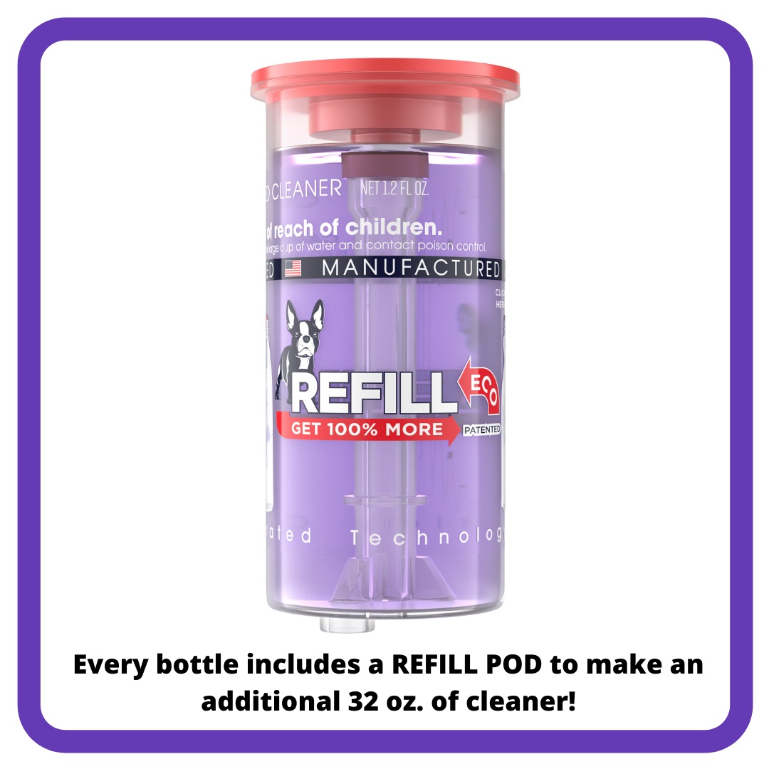 Our patented refill system, allows you to get an ADDITIONAL 32 oz. of Urine & Odor Destroyer by simply refilling your eco-bottle with water and releasing the included concentrate.
