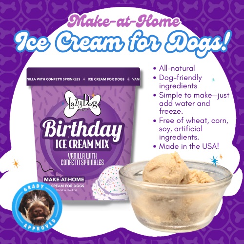 Treat your pooch to a homemade drool worthy scoop of ice cream with The Lazy Dog Cookie Co. Make at Home Birthday Cake flavored ice cream mix. The ice cream mix is made with simple, wholesome and dog-friendly ingredients like nonfat dried whole milk & dried vanilla. Not to mention the natural confetti sprinkles! You can feel good about treating your pal on his special day or making any day extra special, since it has no wheat, corn, soy or fillers. Preparing our ice cream mix is a cinch by just adding a ½ cup of water then freeze for 8 hours.