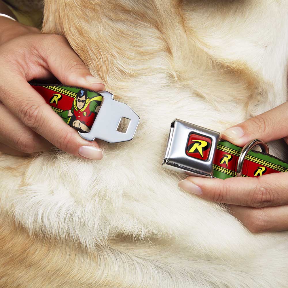 Robin "R" Logo Full Color Red/Black/Yellow Seatbelt Buckle Collar - Robin Action Pose/"R" Logo Stripe Green/Yellow/Red/Black