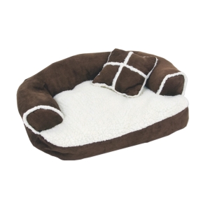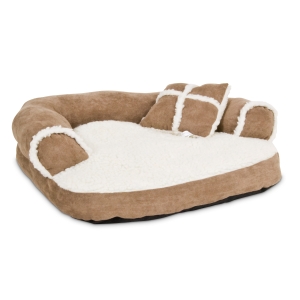 Are Pet parents tired of telling your pet to get off the couch? Let them get their pet its very own Aspen Pet® Sofa Bed with Pillow to lounge on when it's couch potato time. This miniature-sized sofa is great for small pets and is topped with plush and stuffed with 100% recycled high-loft fiberfill for ultra comfort. The bed is machine washable for easy care and for keeping your pets' sleeping space clean and your home smelling fresh. Supported sides provide a sense of security and the soft exterior unzips for easy machine washing to keep your pet's sleeping space clean and your home smelling fresh. Beautiful decorative trim is a stylish Sherpa fleece with suede bolster and gusset. Ships in assorted colors.
