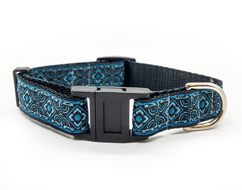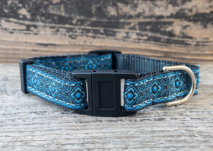 Tudor Tabby is for the feline King (or Queen) of your castle! This finely embellished design features a rich black background inset with stylized tiles of cerulean blue diamonds, scrollwork and finished with edgings reminiscent of medieval castle parapets.