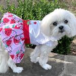 Be the cutest pup at the party with our Strawbery Picnic Dog Dress. Lace trim at the collar and embroidered strawberries on the collar and belt make this dress so sweet you could eat it up! Also features red heart shaped buttons.