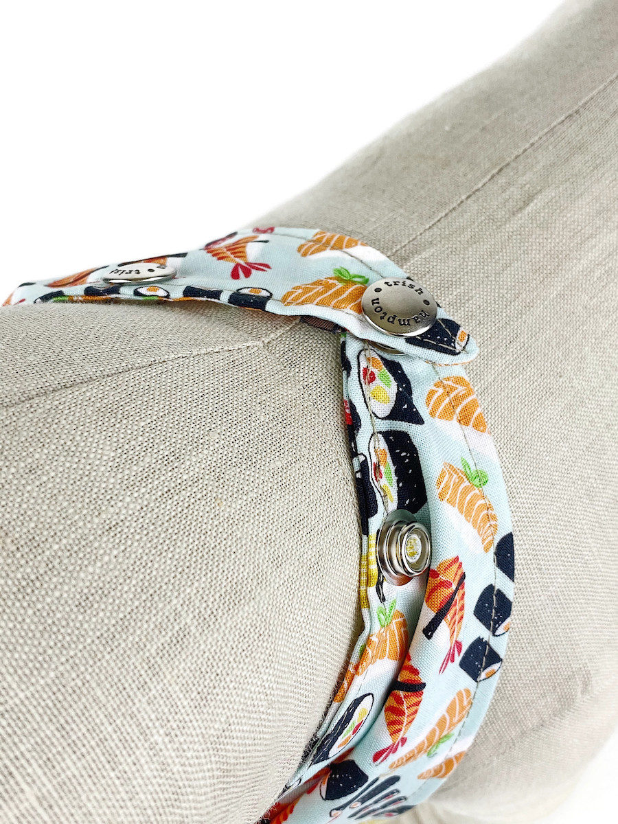 Our snappy bandana (dog-bana) has two snap closures that can be sized in three different combinations, allows for a fashionable yet comfy fit. Wear tighter for a flatter fit and a bit looser for a comfy look.
