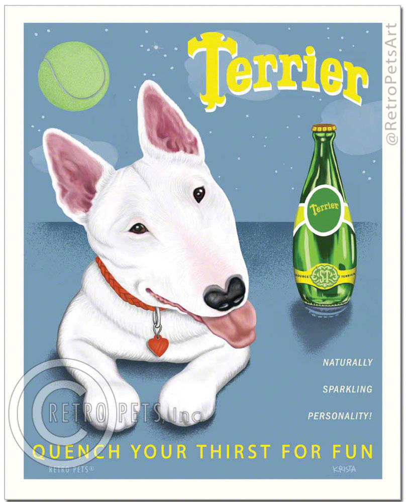 A spoof on the great Perrier posters of the 40's. People have been asking for a Bull Terrier print for a while... here ya go! 8x10 art print. Printed onto acid-free cover stock; backing board, artists bio & poly sleeve.