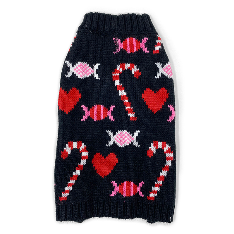 Black sweater with red and white candy graphics makes this sweater fun and festive for the holiday season.