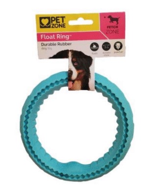 Pet Zone® Float Ring Dog Toy is an interactive indoor and outdoor dog toy with a unique mix of materials. This combination of materials creates a product that crosses multiple play types allowing a dog to fetch, tug, and chew.