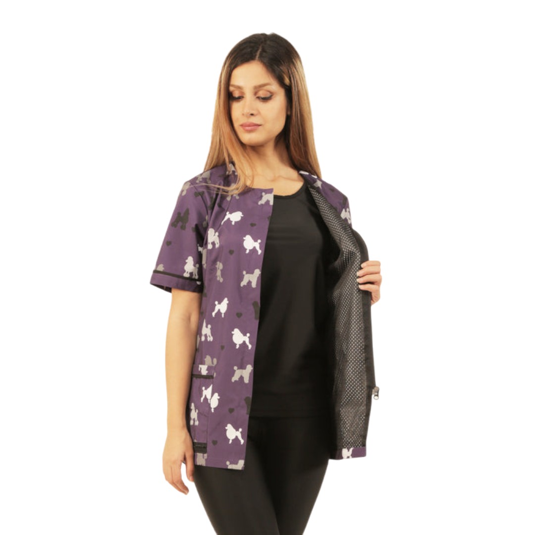 Ladybird Line’s purple poodle design grooming jacket, a functional, fashionable jacket for any groomer